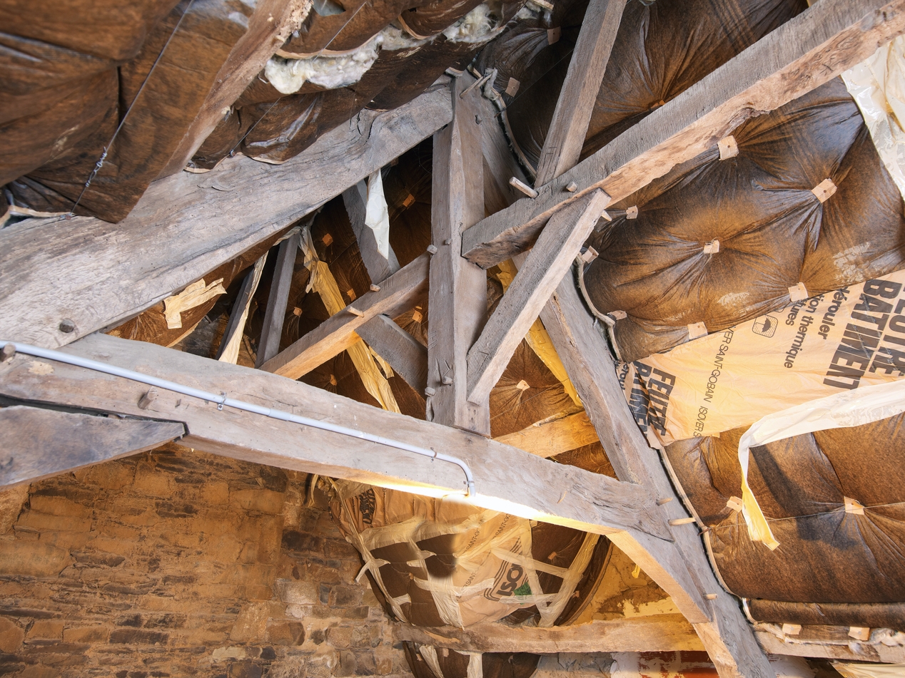 Minihy-Tréguier, 9 rue du Bourg : logis principal, étage de comble (vers le pignon ouest), détail de la charpenteImmatriculation