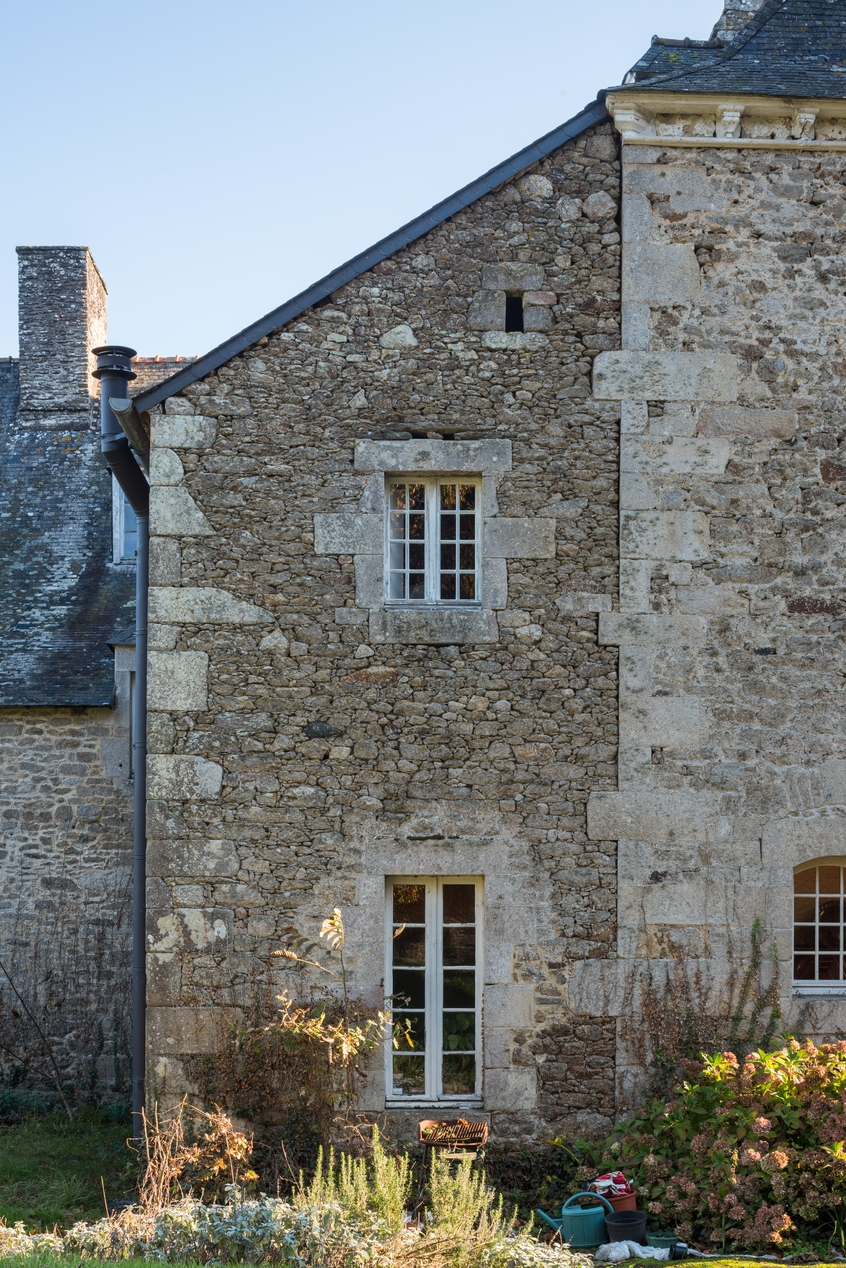 Appentis à un étage accolé à la façade nord. Les pierres d'accroches montrent qu'un projet d'agrandissement au nord était prévu lors de la reconstruction au 18e siècle.Immatriculation