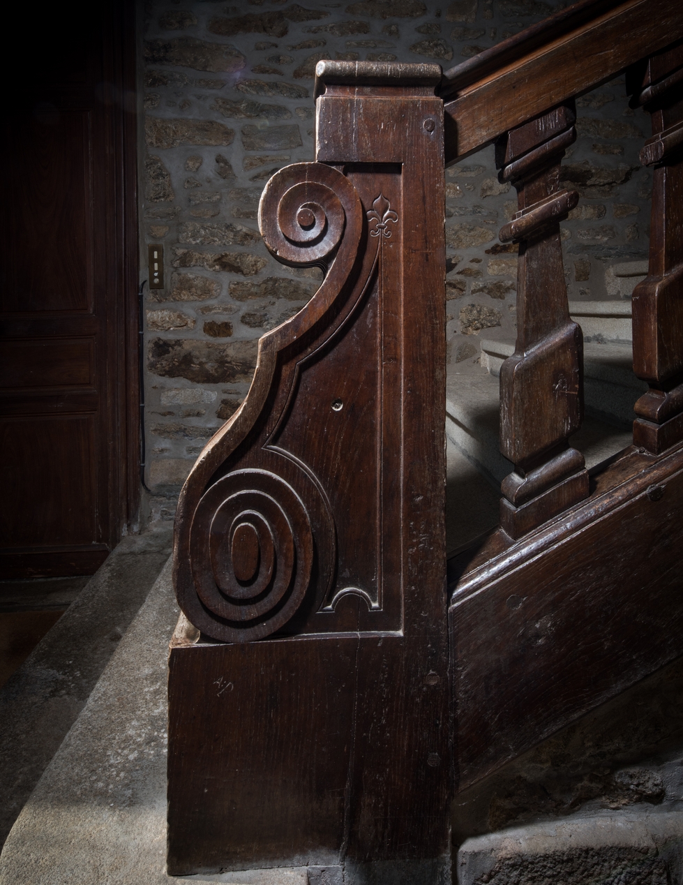 Détail du départ de l'escalier du 18e siècle en forme d'enroulement, sculpture d'une fleur de lys à droite de l'enroulement haut.Immatriculation