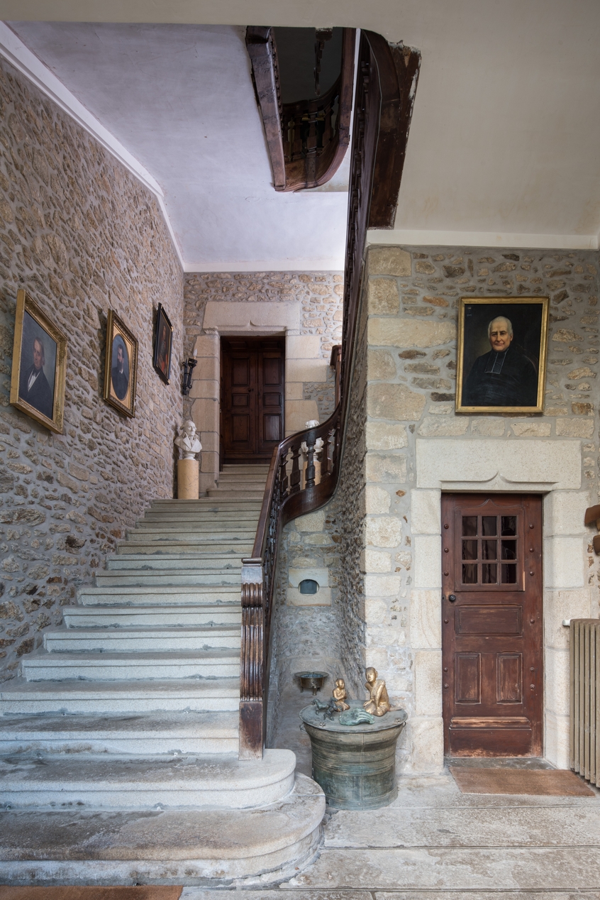 Entrée principale : escalier de distribution central en pierre et rampe en bois.Immatriculation