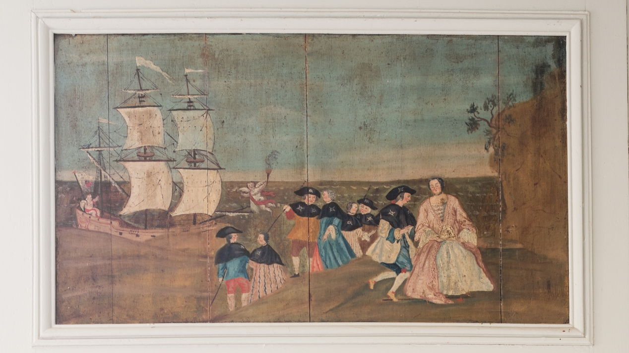 Détail du panneau au-dessus du placard sur le mur sud : scène de retrouvaille après un voyage en mer.Immatriculation
