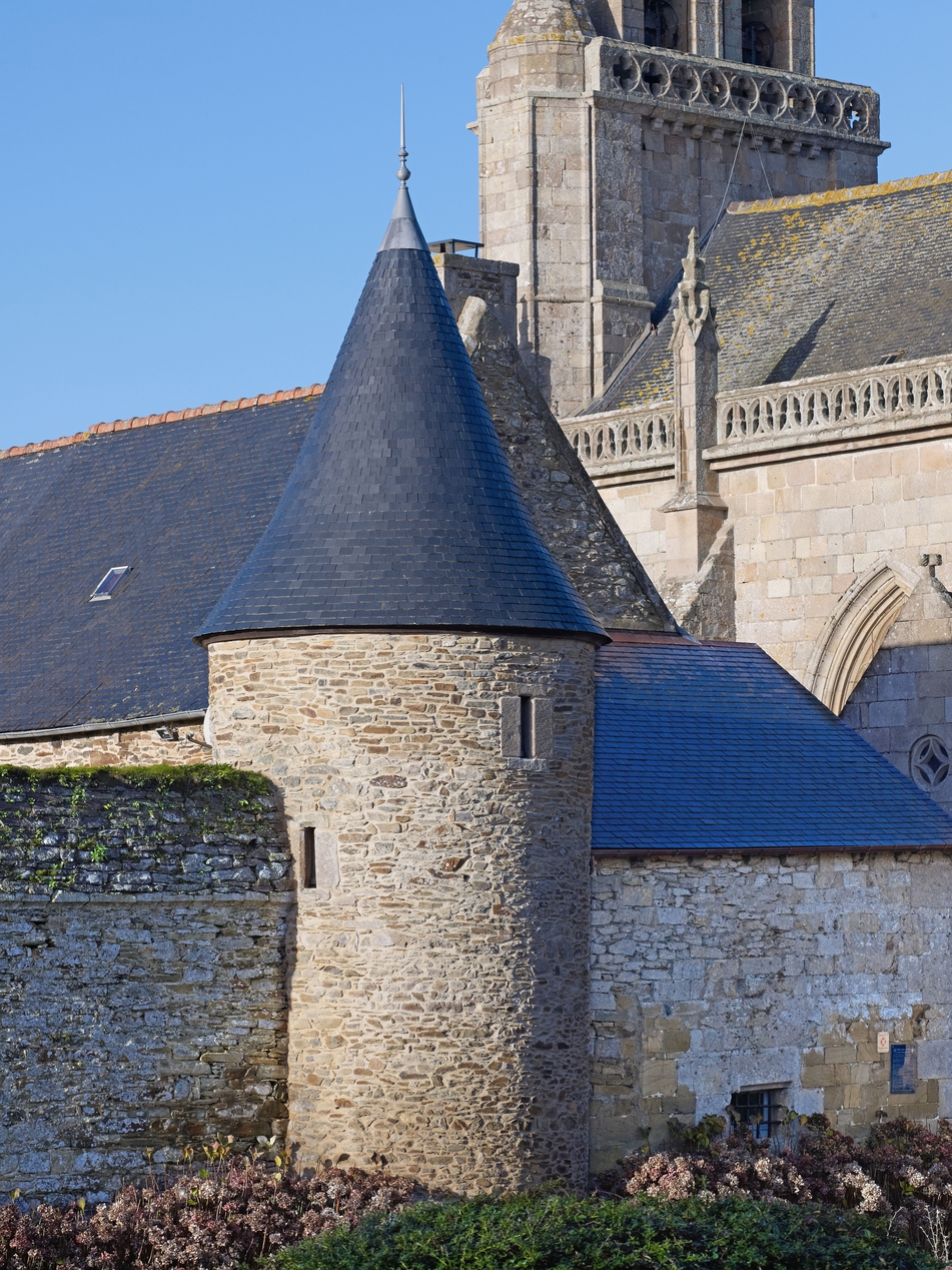 Détail de la tourelle depuis la rue du Bourg (toit conique de la tourelle restauré). En arrière-plan, l'église Saint-YvesImmatriculation