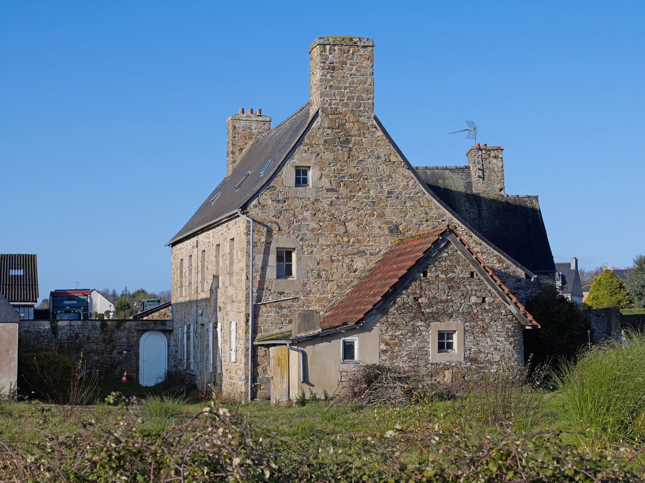 Minihy-Tréguier, 9 rue du Bourg : maison datée par millésime de 1737, vue générale depuis l'estImmatriculation