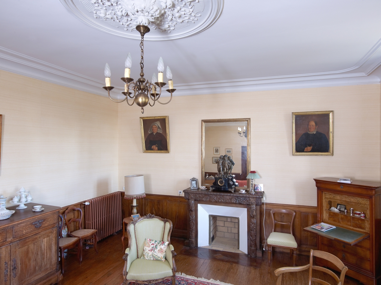 Minihy-Tréguier, Crec'h an Goué : logis, vue du salon avec cheminée, boiseries et portaits des ancêtresImmatriculation