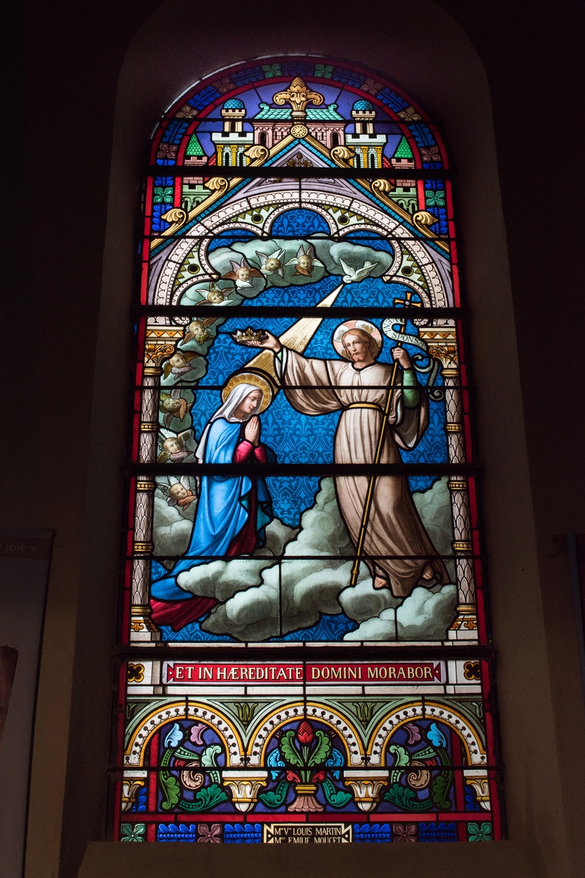 Vitrail du mystère glorieux du Couronnement de la Vierge.Immatriculation