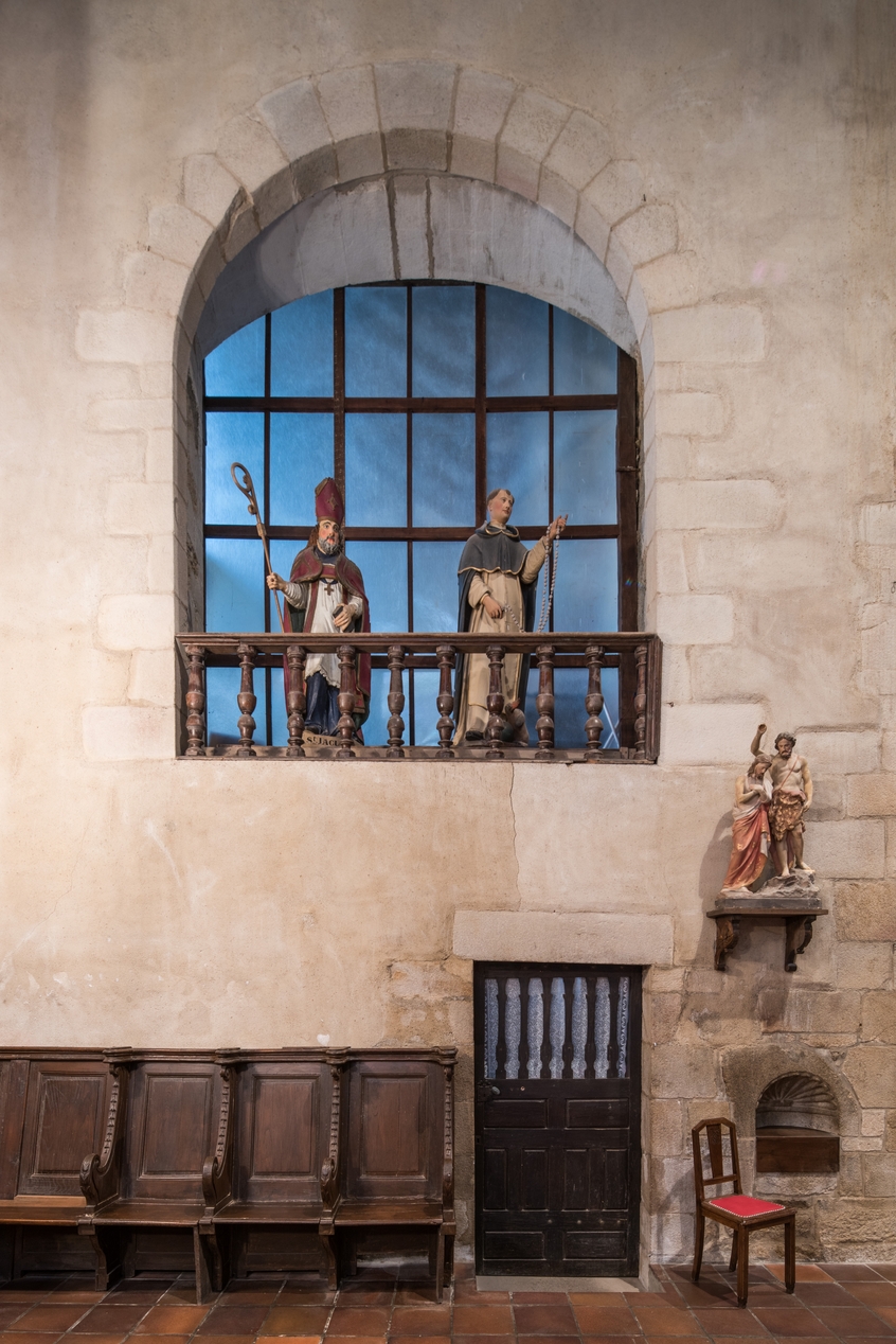 L'ouverture permettait aux religieux de suivre la messe sans être en contact avec les laïcs. Statues en bois polychrome de saint Jacut et de saint Dominique.Immatriculation