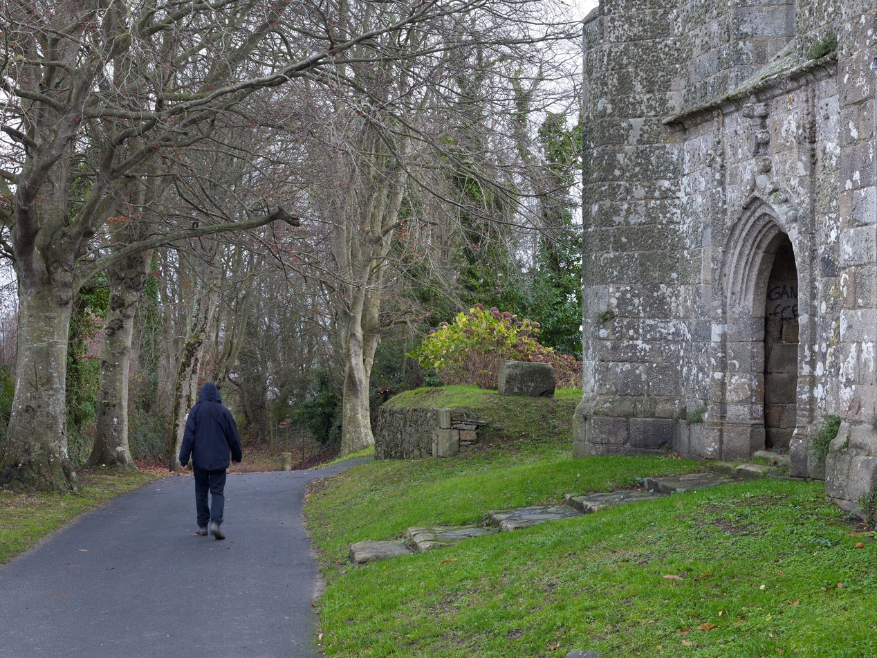 Tréguier : l'allée Saint-Michel depuis le sud et la tour Saint-Michel. Ce chemin est flanqué au nord d'un talus-mur en maçonnerie de moellonImmatriculation