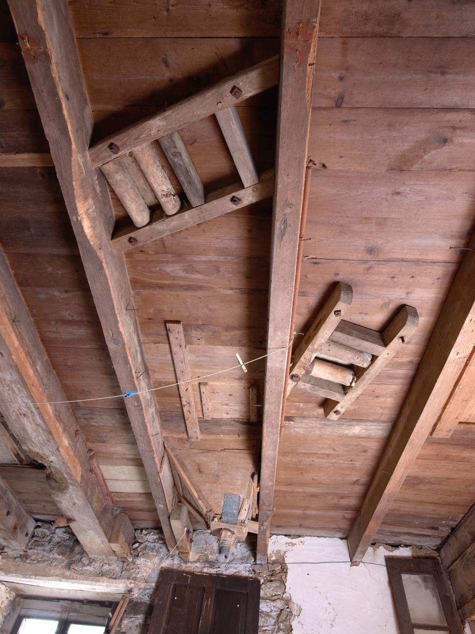 Minihy-Tréguier, le Guindy : moulin de Troguindy, vue intérieure, détail du plafond du premier étageImmatriculation