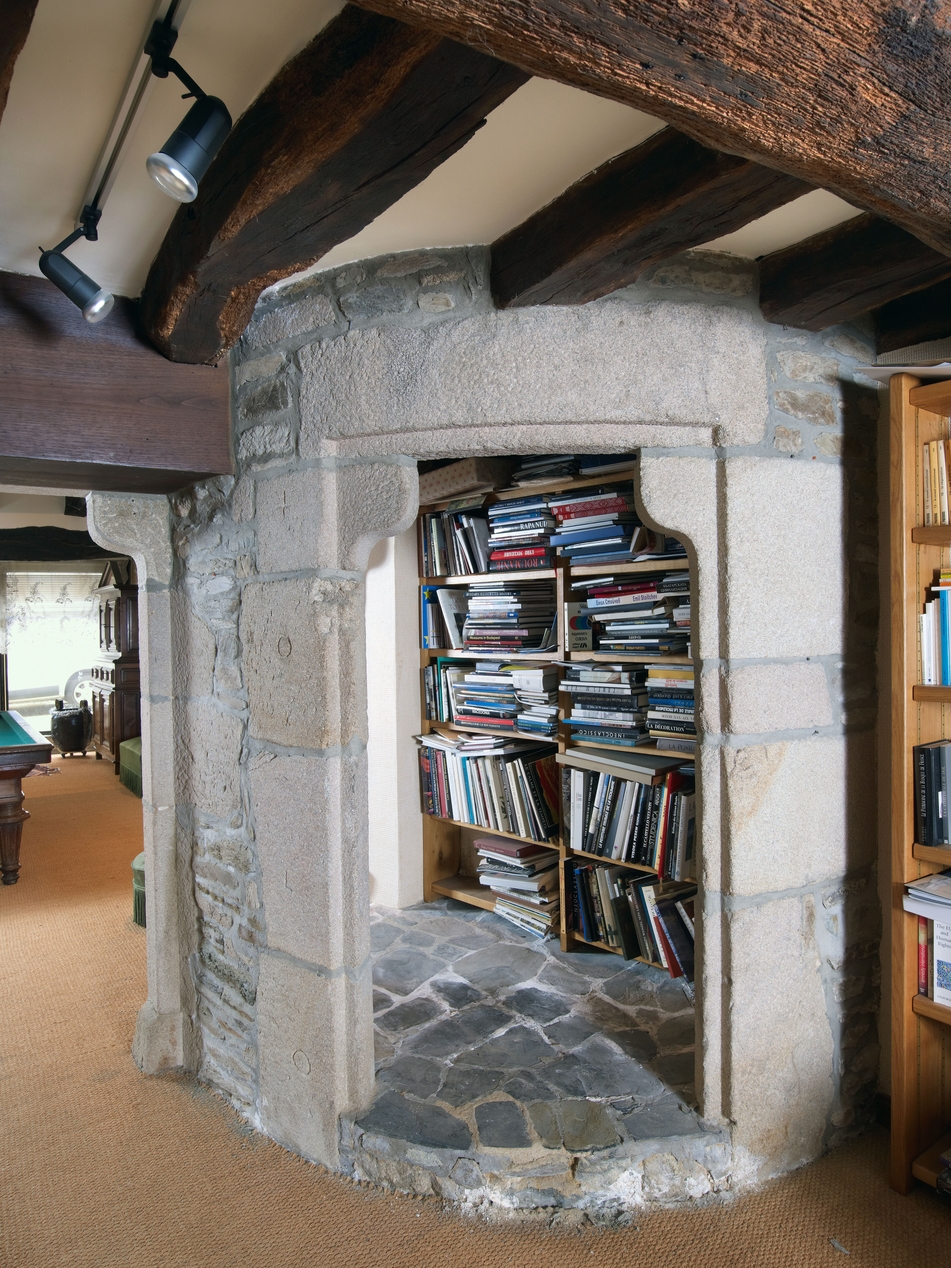 Tréguier, 12 rue Colvestre : maison à pan de bois, rez-de-chaussée : salle basse manoriale sur rue (au sud), détail de la porte de la cage d'escalier, linteau sur coussinetImmatriculation