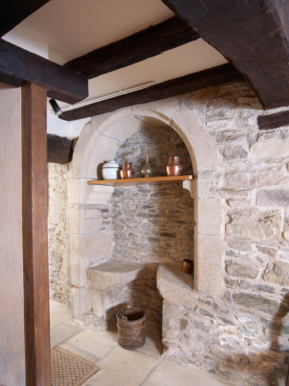 Tréguier, 12 rue Colvestre : maison à pan de bois, rez-de-chaussée : salle basse manoriale sur rue (au sud), détail du grand vaisselier mural en arc plein cintre à chanfrein large doté de deux tablettes avec évier (mur gouttereau est)Immatriculation