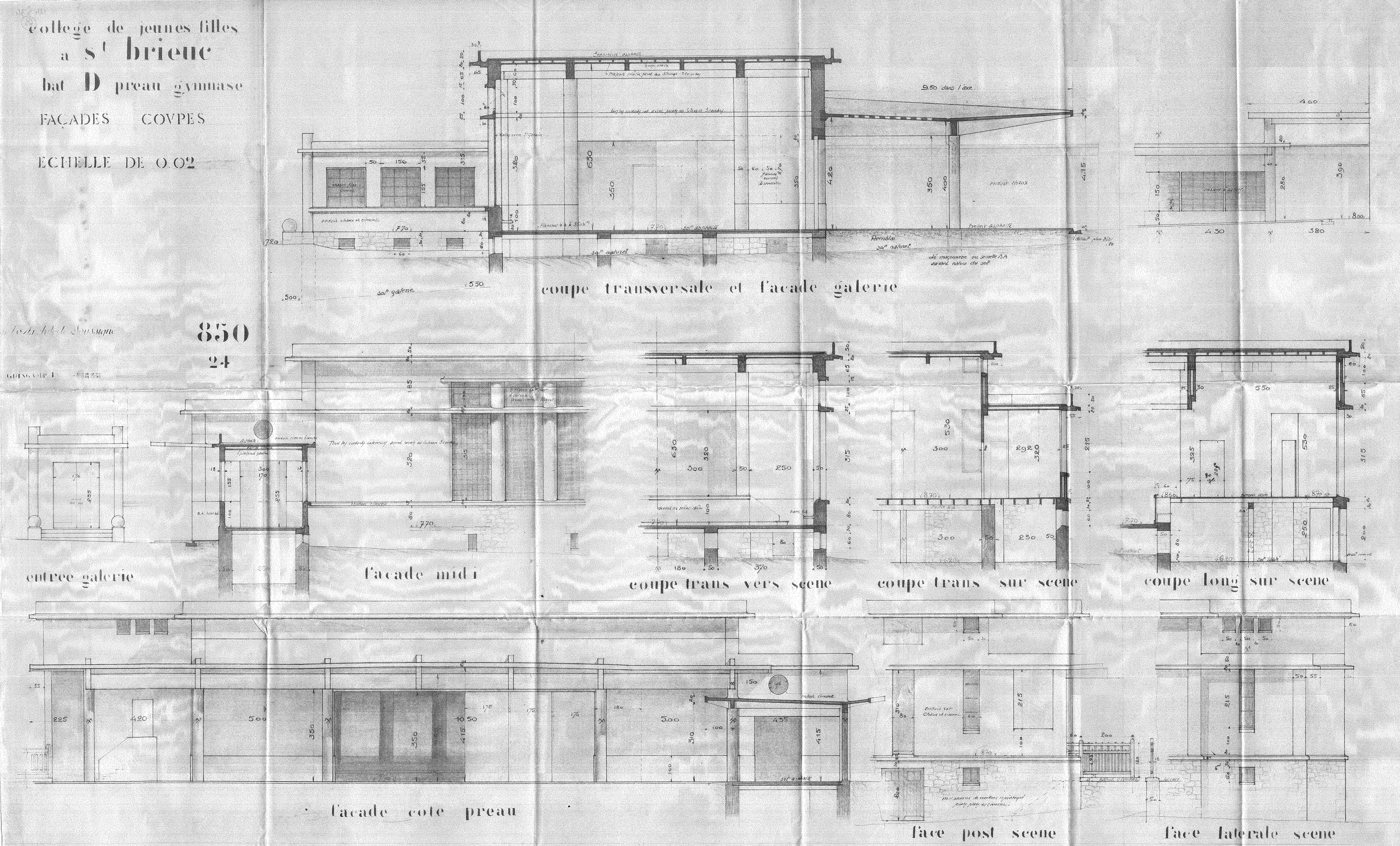 AD Côtes-d'Armor : 124 J 64. Préau gymnase : façades et coupes. G.-R. Lefort, 1934.