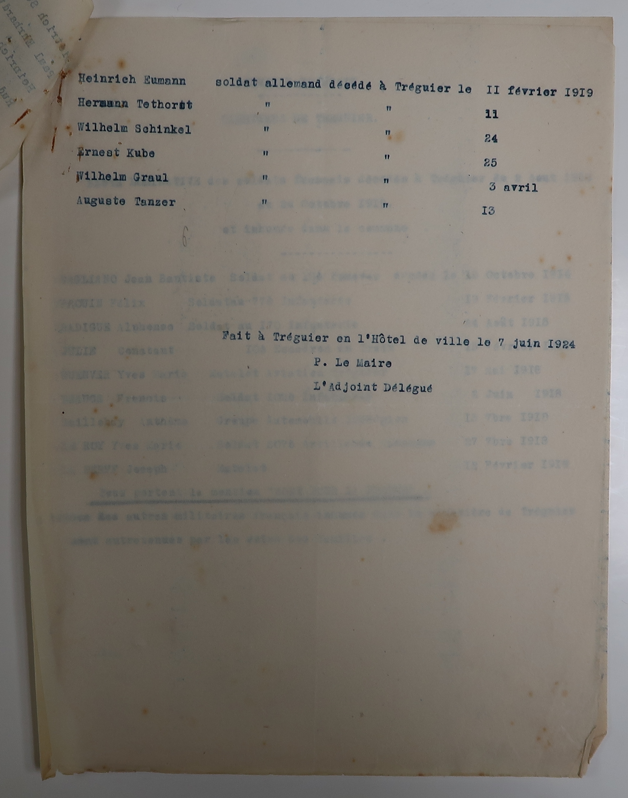 Tréguier, cimetière Saint-Fiacre et carrés militaires français et allemands : liste nominative des soldats alliés et ennemis décédés à Tréguier du 2 août 1914 au 24 octobre 1919 et inhumés dans la commune, 7 juin 1924 (Archives municipales de Tréguier, 4H46)Immatriculation