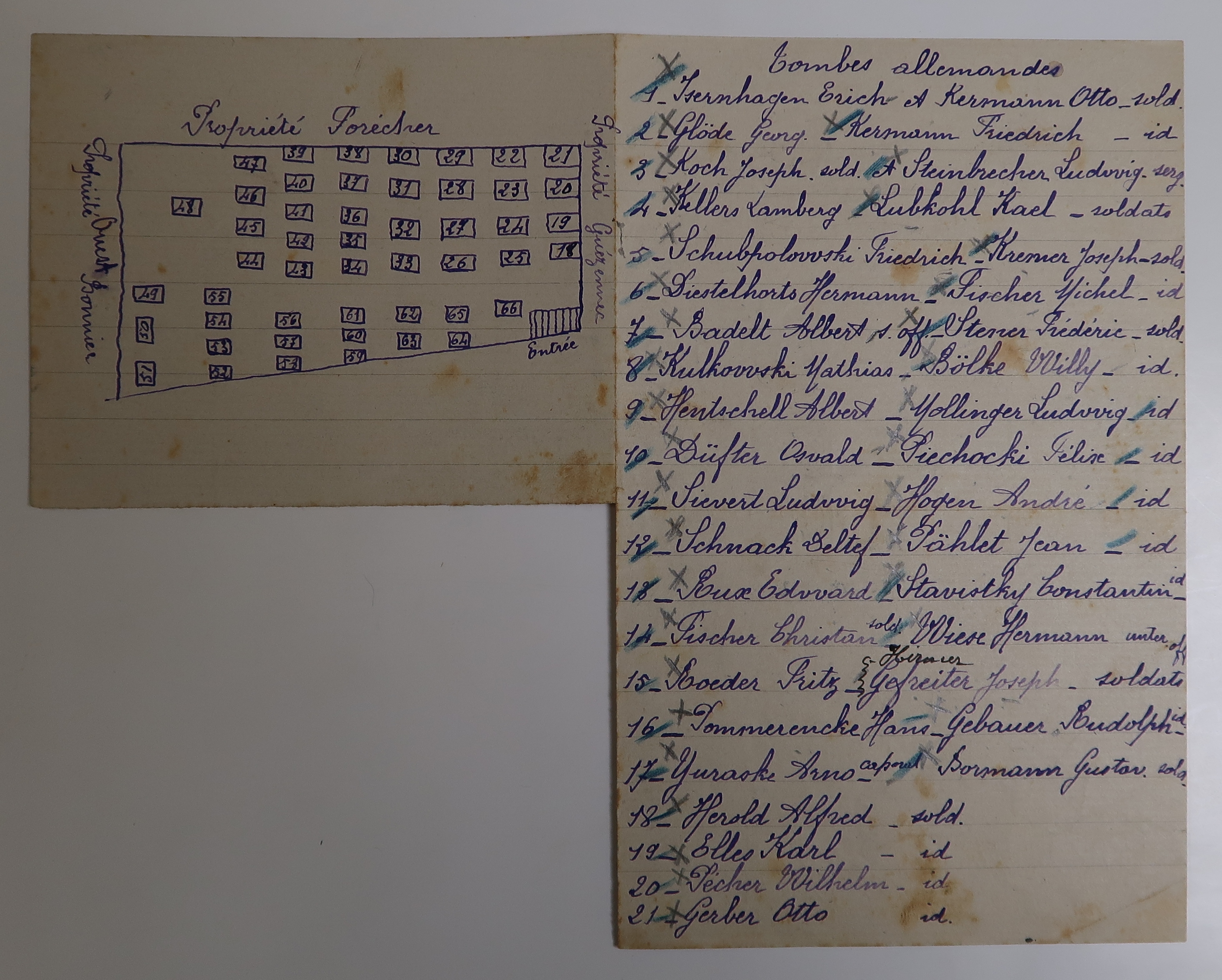 Tréguier, cimetière Saint-Fiacre et carrés militaires français et allemands : schéma d'implantation et liste nominative des soldats allemands inhumés à Tréguier (Archives municipales de Tréguier, 4H46)Immatriculation