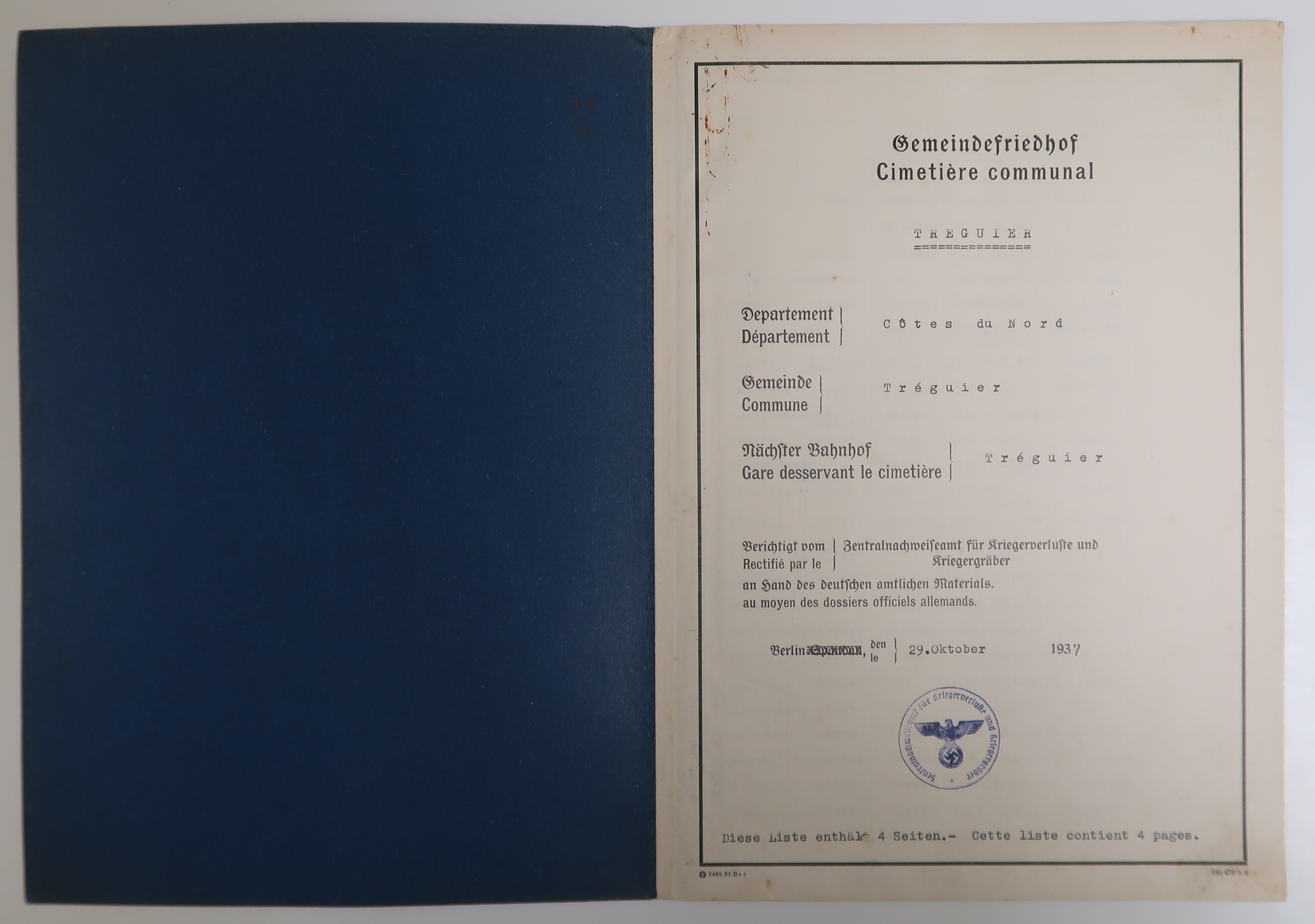 Tréguier, cimetière Saint-Fiacre et carrés militaires français et allemands : liste nominative des soldats allemands inhumés à Tréguier, 29 octobre 1937 (Archives municipales de Tréguier, 4H46)Immatriculation