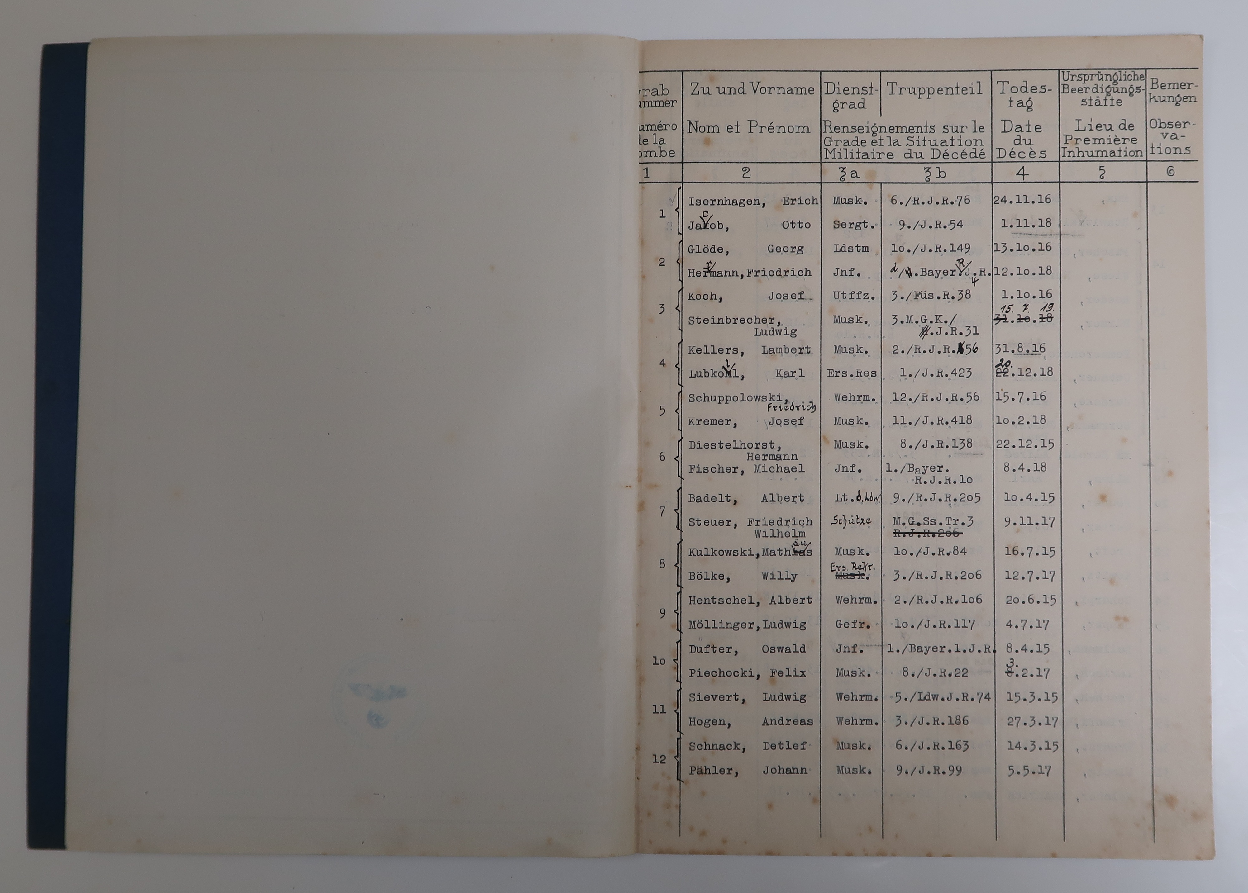 Tréguier, cimetière Saint-Fiacre et carrés militaires français et allemands : liste nominative des soldats allemands inhumés à Tréguier, 29 octobre 1937 (Archives municipales de Tréguier, 4H46)Immatriculation