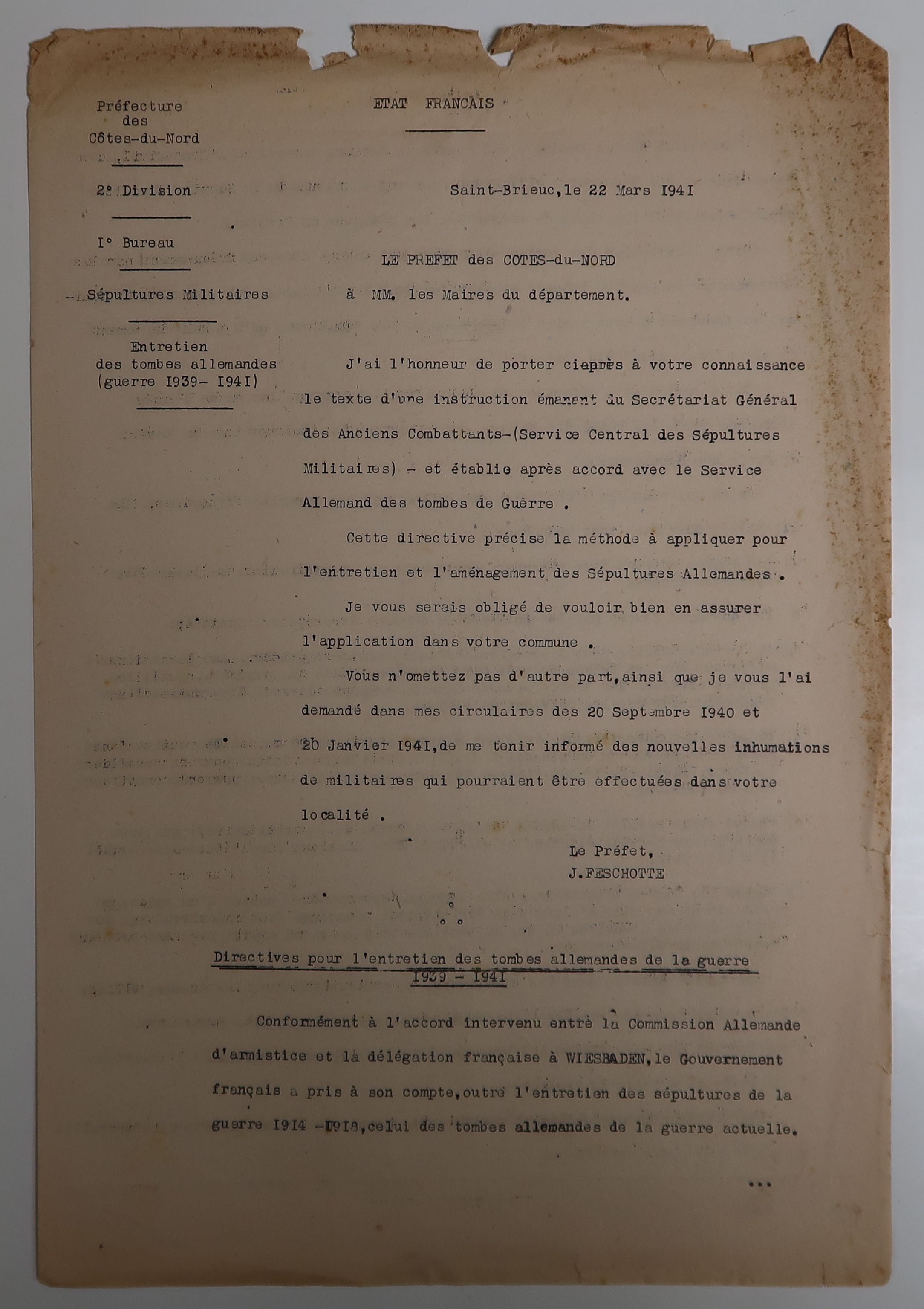 Tréguier, cimetière Saint-Fiacre et carrés militaires français et allemands : directives pour l'entretien des tombes allemandes de la "guerre 1939-1941" par la préfecture des Côtes-du-Nord, 22 mars 1941 (Archives municipales de Tréguier, 4H46)Immatriculation