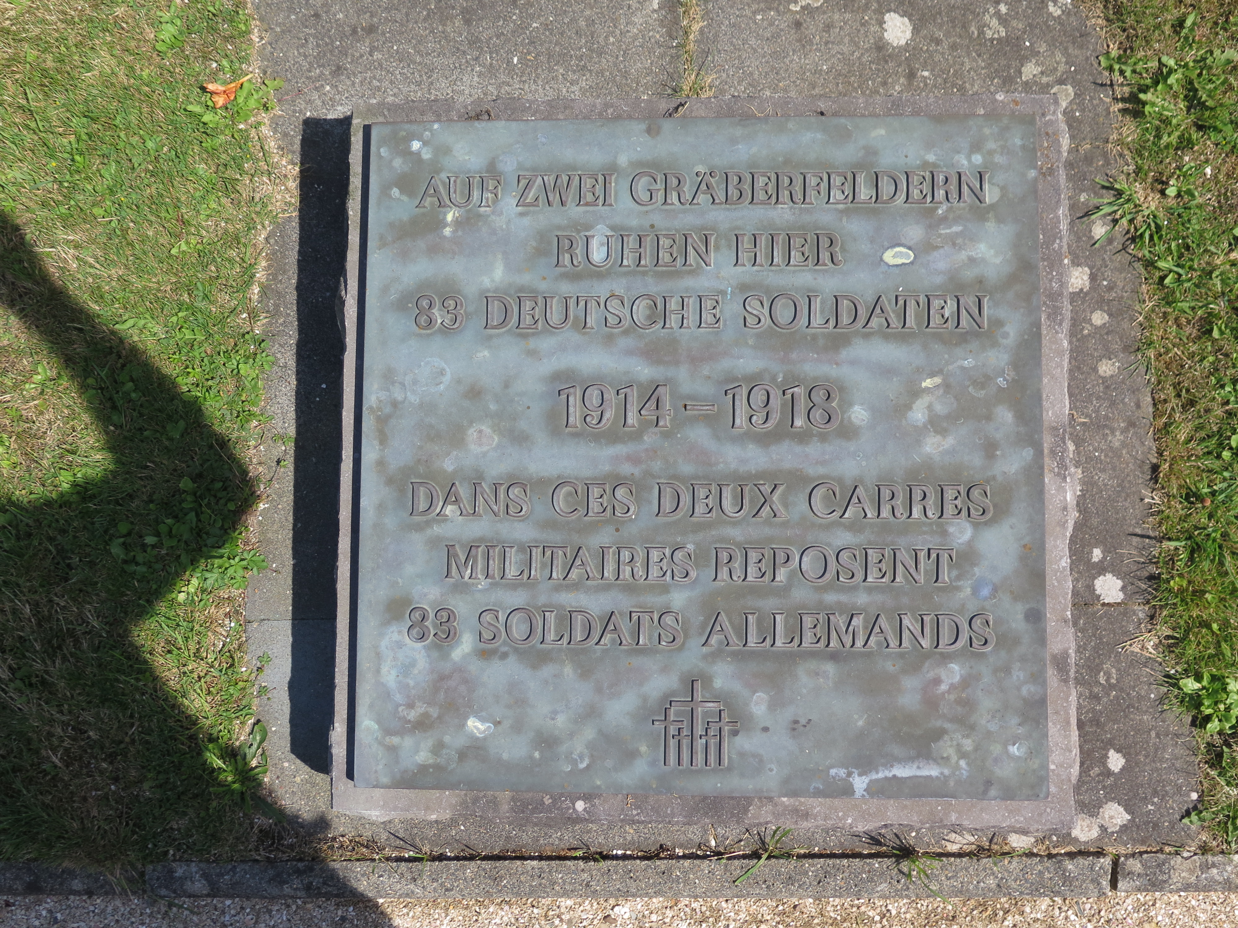 Tréguier : cimetière Saint-Fiacre, carré militaire allemand, plaque commémorative en allemand et en français. On peut lire en français : "1914-1918 / DANS CES DEUX CARRES MILITAIRES REPOSENT 83 SOLDATS ALLEMANDS"Immatriculation