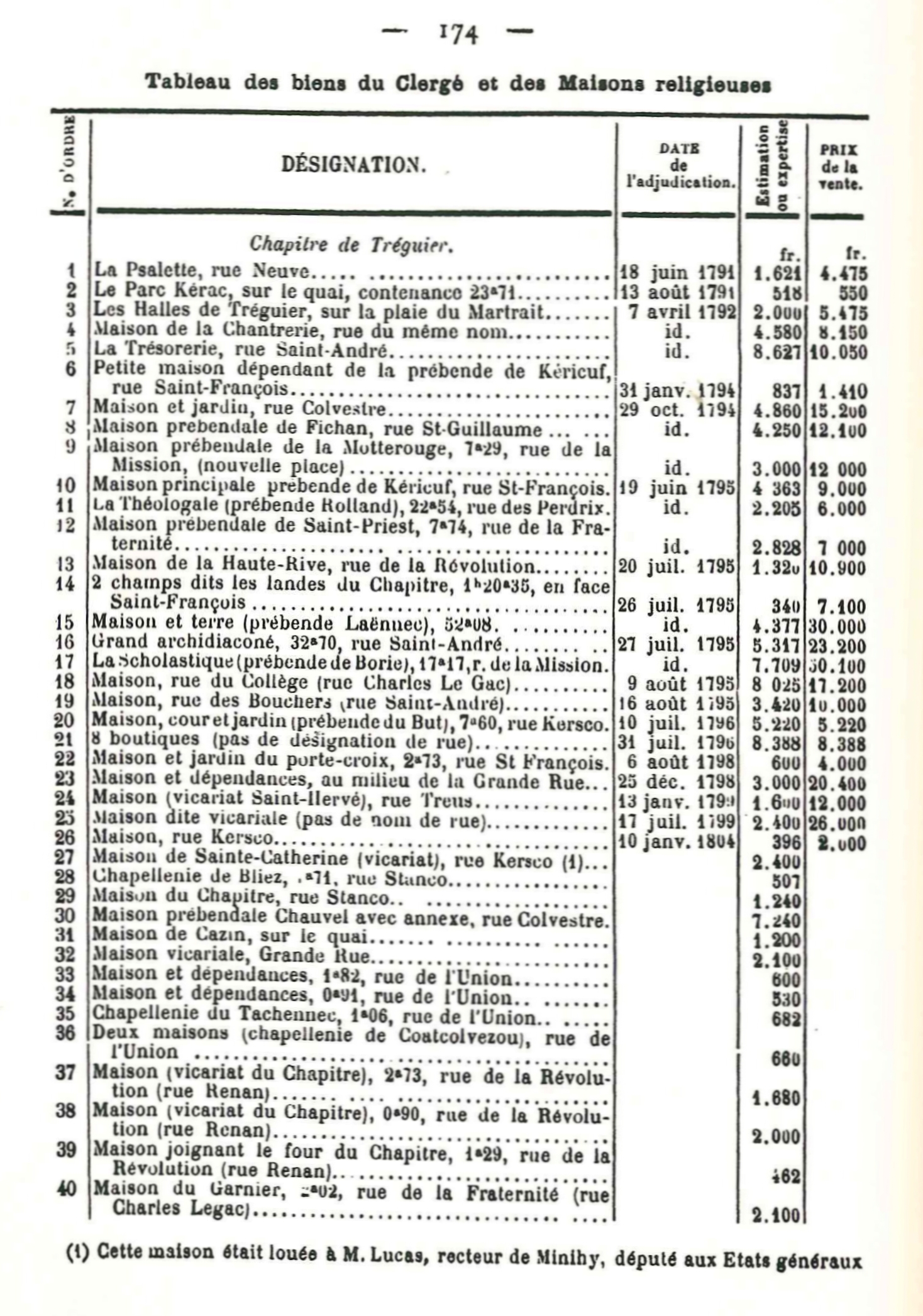 Tréguier : tableau des biens du Clergé et des Maisons religieuses par Adolphe Guillou (Essai historique sur Tréguier par un Trécorrois, p. 174)Immatriculation