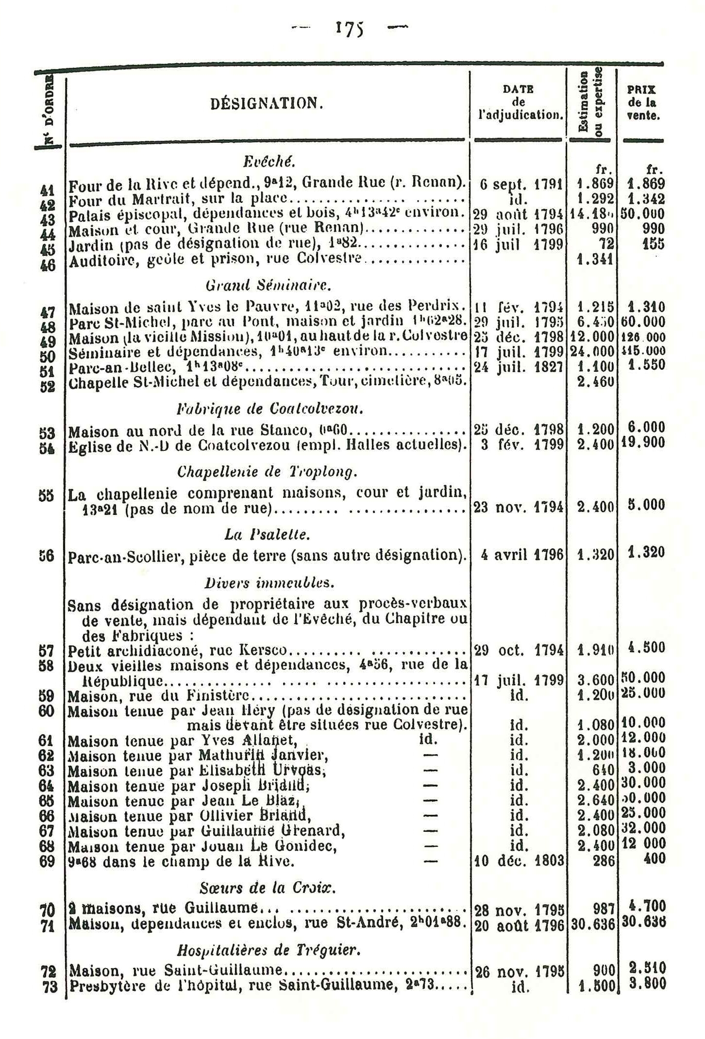 Tréguier : tableau des biens du Clergé et des Maisons religieuses par Adolphe Guillou (Essai historique sur Tréguier par un Trécorrois, p. 175)Immatriculation
