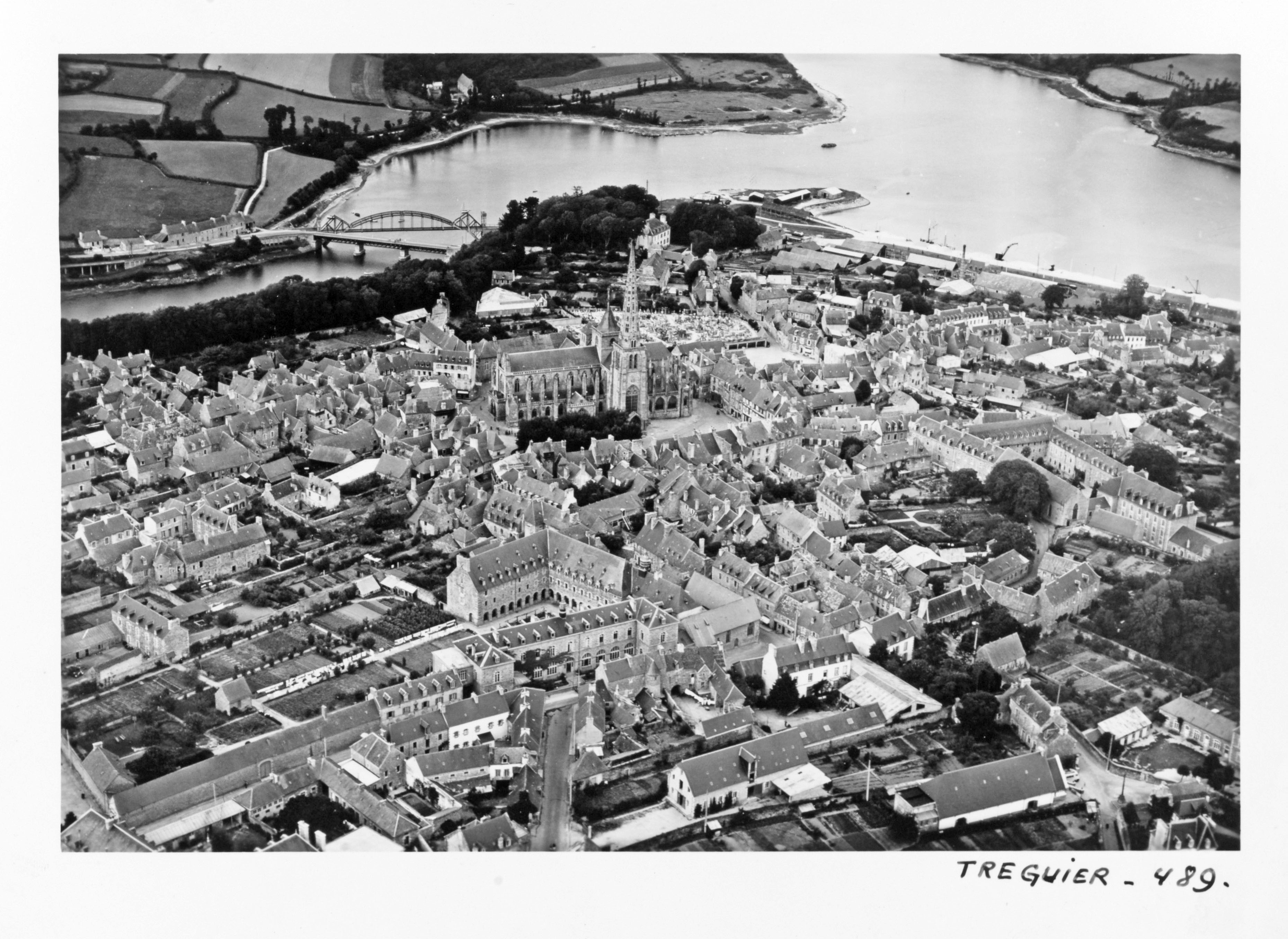 Tréguier : vue aérienne oblique de la ville depuis le sud-sud-ouest par Roger Henrard, vers 1954 (Archives départementales des Côtes-d'Armor, collection photographique Henrard : FRAD022_26Fi_455). Au-dessus du Guindy, les "Ponts noirs", pont routier et pont ferrovaireImmatriculation