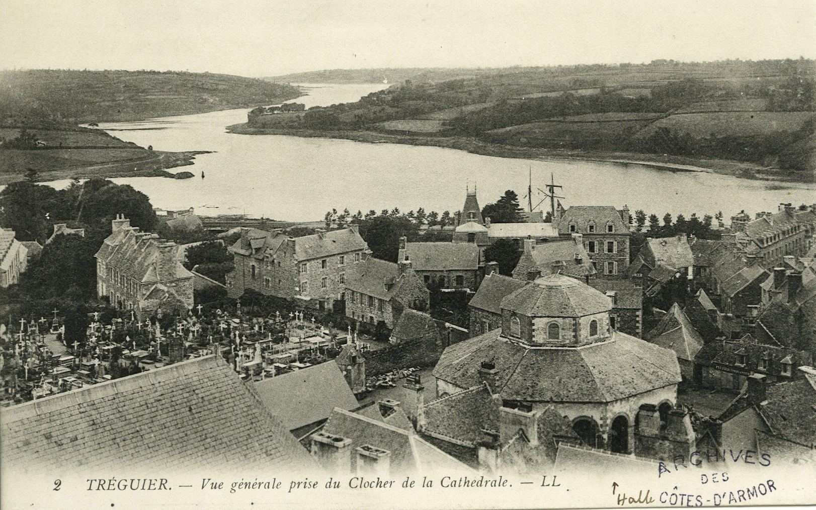 Tréguier : vue partielle de la ville en direction de l'embouchure de la rivière, carte postale (Archives départementales des Côtes-d'Armor : FRAD022_16FI6536_6502). Au premier plan à droite, les anciennes halles implantées place Notre-Dame-de-Coatcolvézou ; au centre la demeure du 8 rue LamennaisImmatriculation