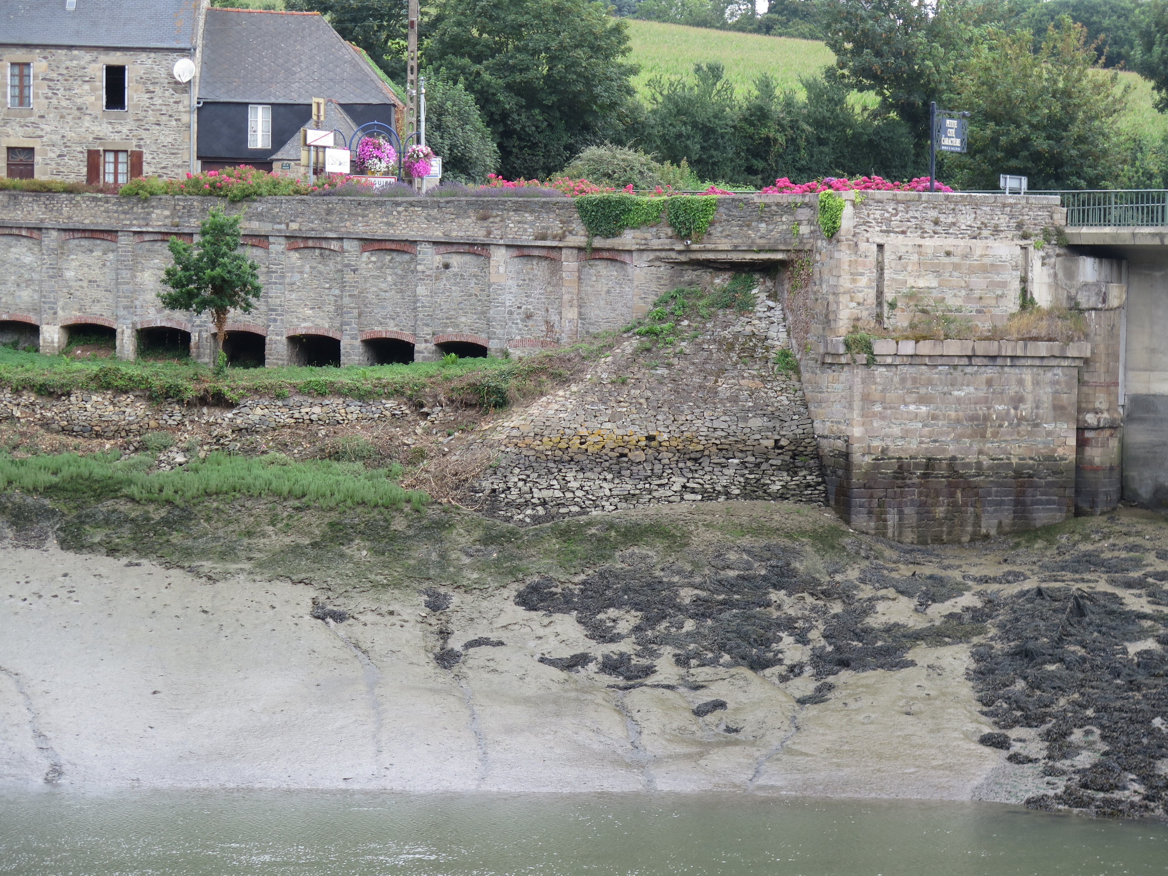 Détail des vestiges de la culée du Pont noir (ancien pont routier) et de la passerelle ou rampe de la ligne de chemin de fer Tréguier – Perros-Guirec côté Plouguiel. On distingue les deux rainures verticales de la poutre en treillis métalliques du tablierImmatriculation