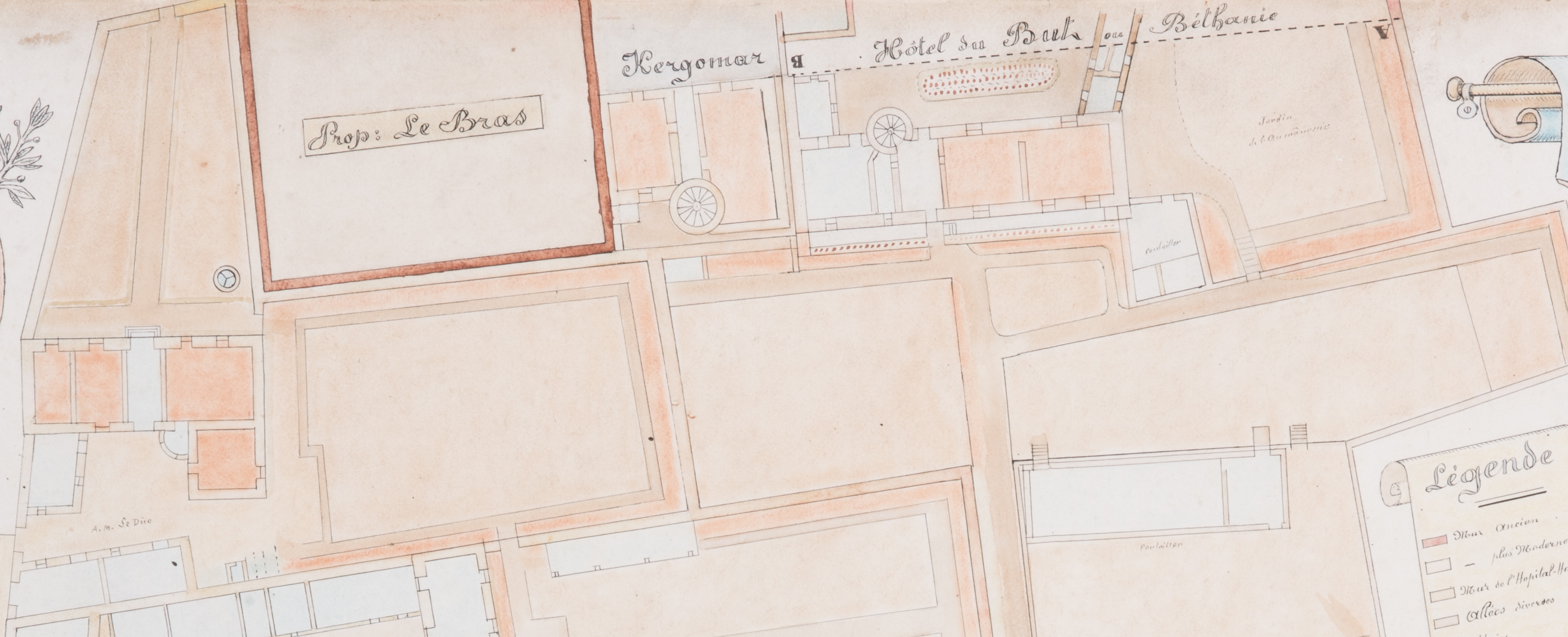 Extrait du plan général du couvent des Augustines alors monastère Sainte-Madeleine et hôpital-hospice de Tréguier par l'abbé Le Vaillant de la maison Saint-Yves, 1954. Au nord figure le manoir urbain de la rue Kercoz dit "Hôtel du But" ou "Béthanie" et le manoir de Kergomar (aujourd'hui détruit)Immatriculation