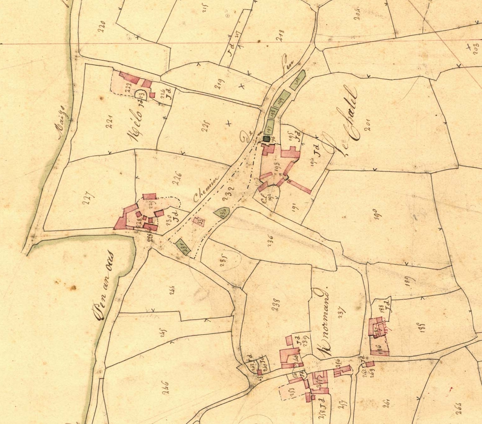 Extrait du cadastre ancien de Minihy-Tréguier, section A1 dite de Saint-Yves, 1835 : "Kerélo" ; "Pen an oas" ; "Le Chatel" (ancien manoir); "Kernormand"Immatriculation