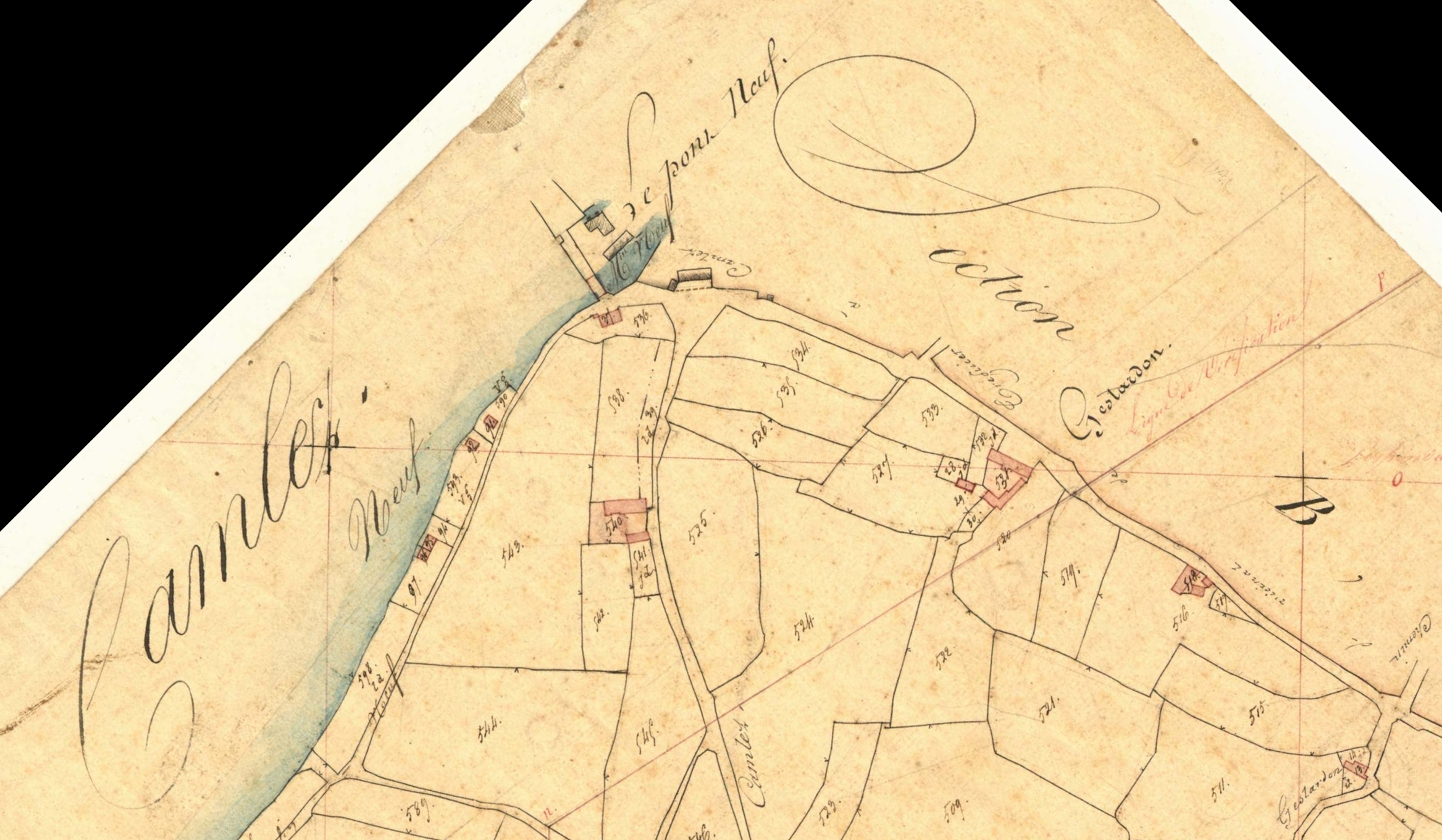 Extrait du cadastre ancien de Minihy-Tréguier, section C2 dite de Kermoal, 1835 : "Le Pont Neuf" ; "Gelardon"Immatriculation