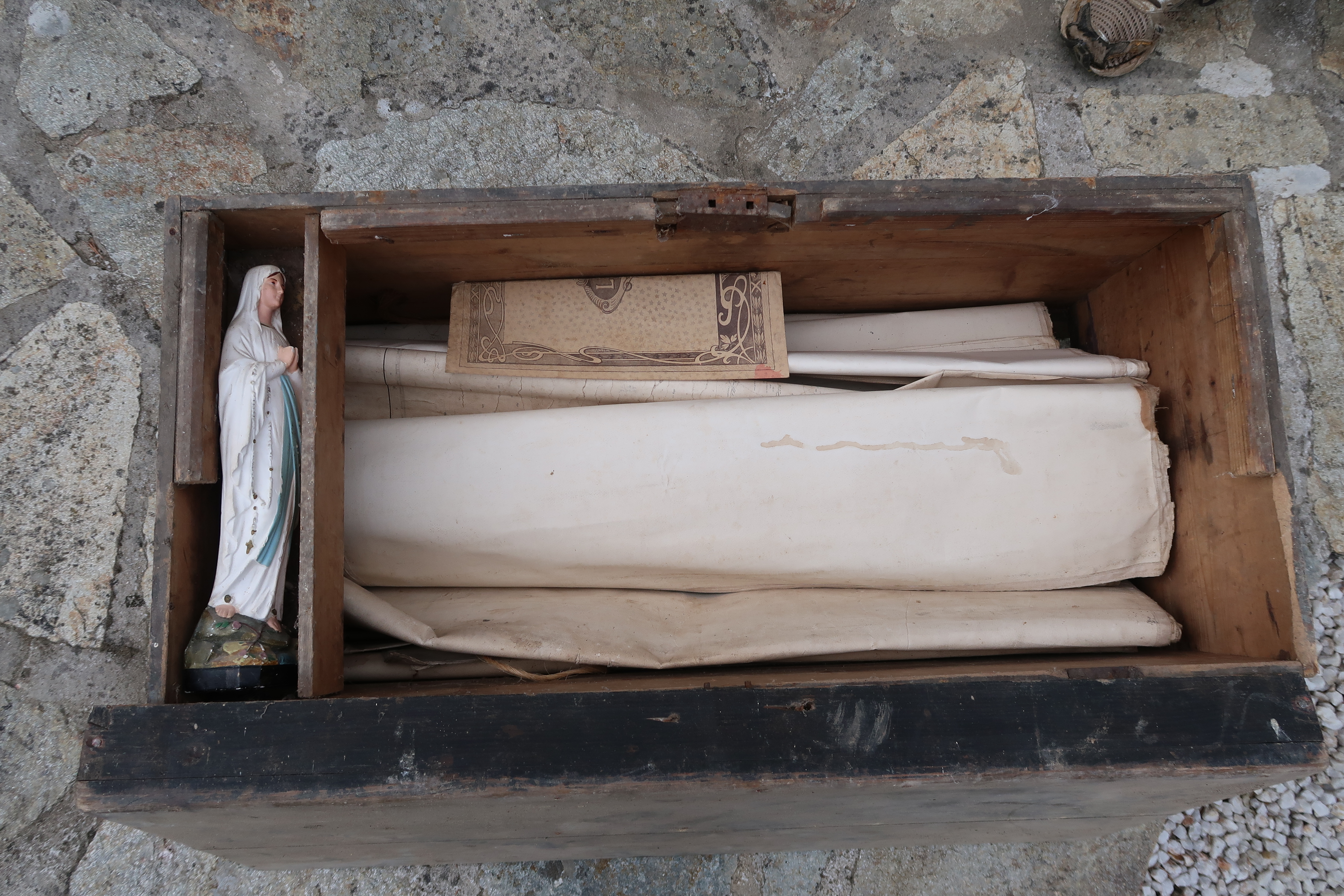 Malle d'Augustin Hamoniaux avec statuette de la Vierge placée dans la case prévue à cet effetImmatriculation
