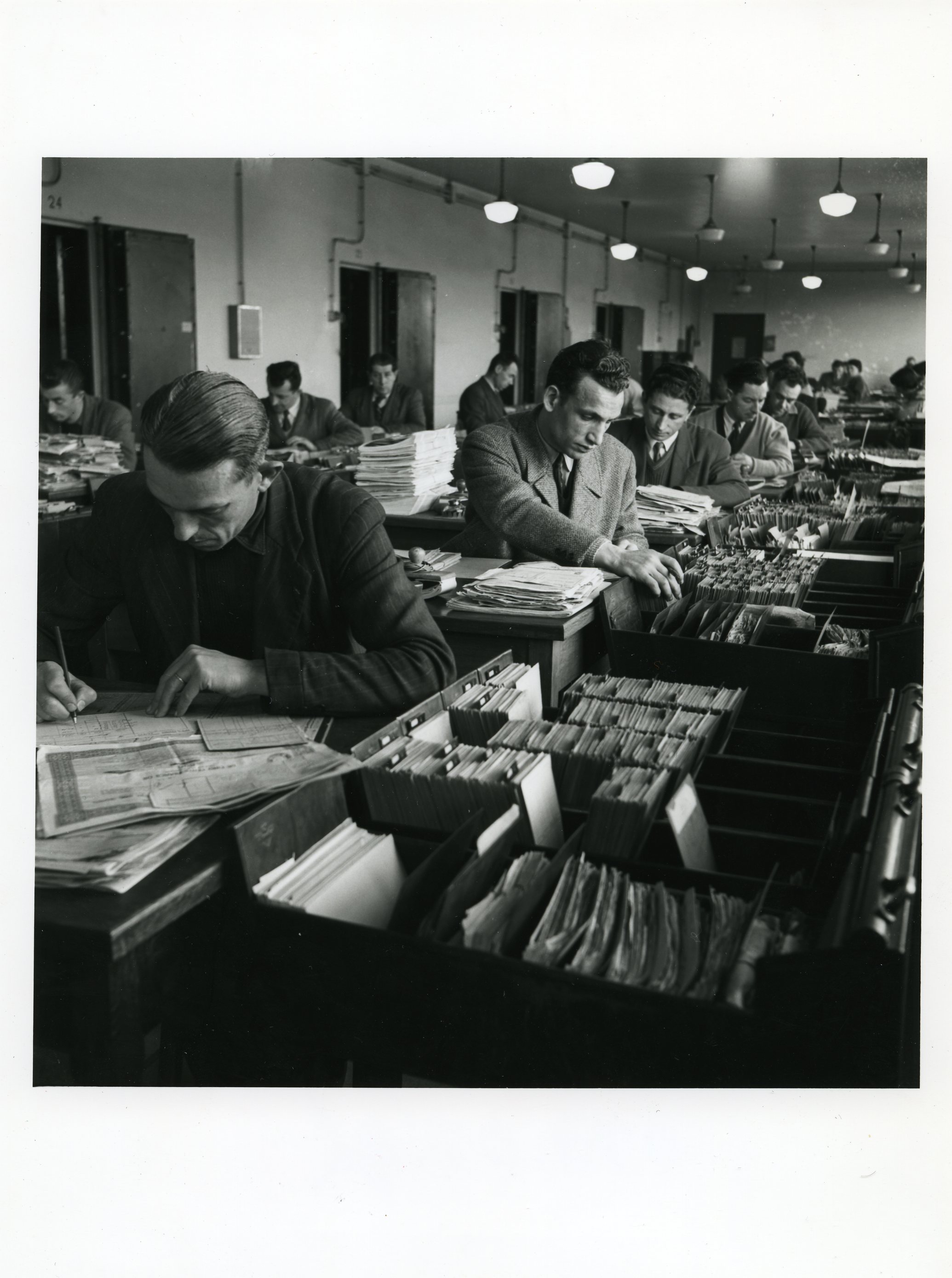 Aile arrière ouest, rez-de-chaussée, vue générale d'une salle des coffres, groupe échéancier, en premier plan, photo entre 1945-1955Immatriculation