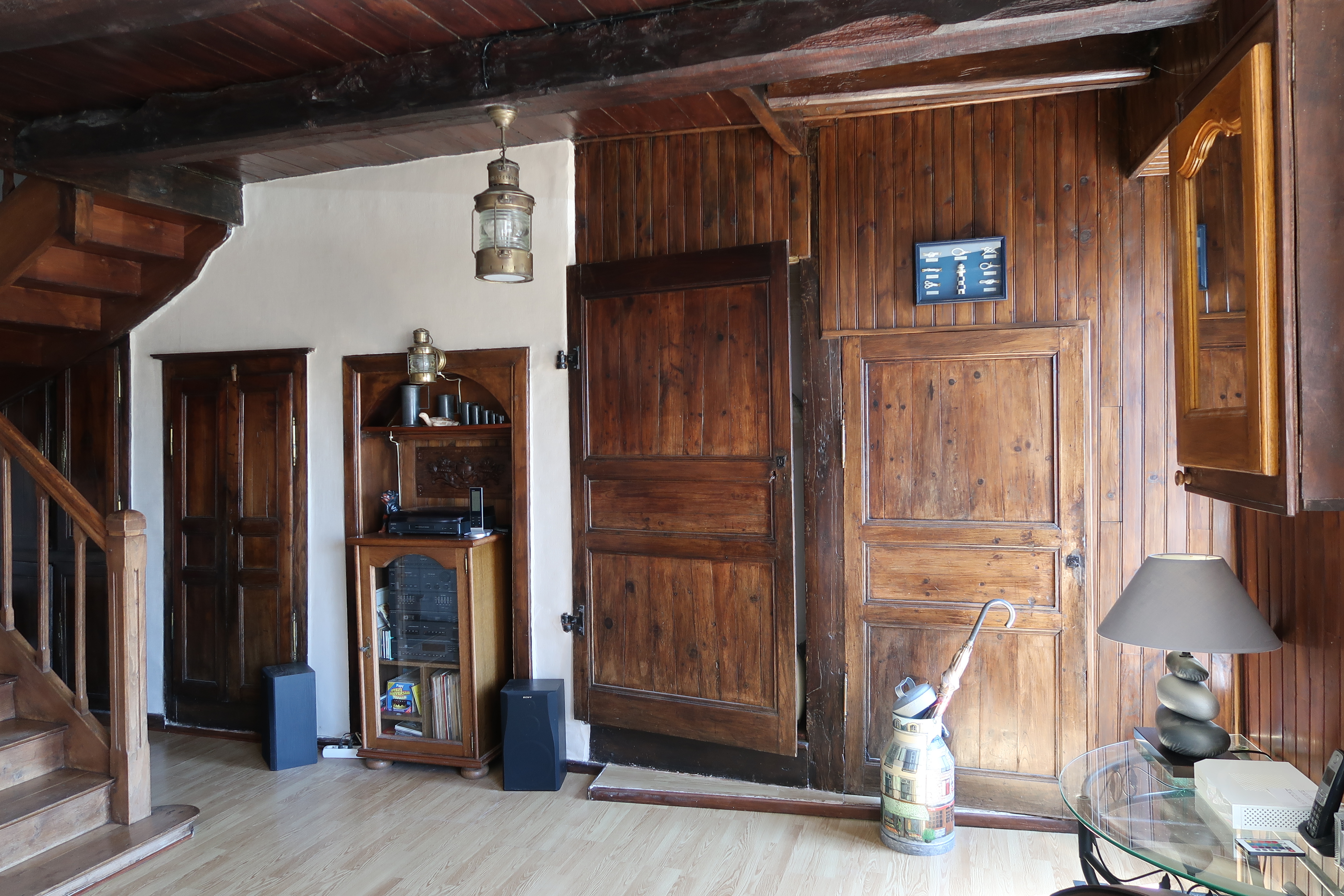 Ferme, vue intérieure de la salle, mur de séparation placard, vaisselier, porte d'accès à l'escalier et porte de communication avec la pièce adjacenteImmatriculation