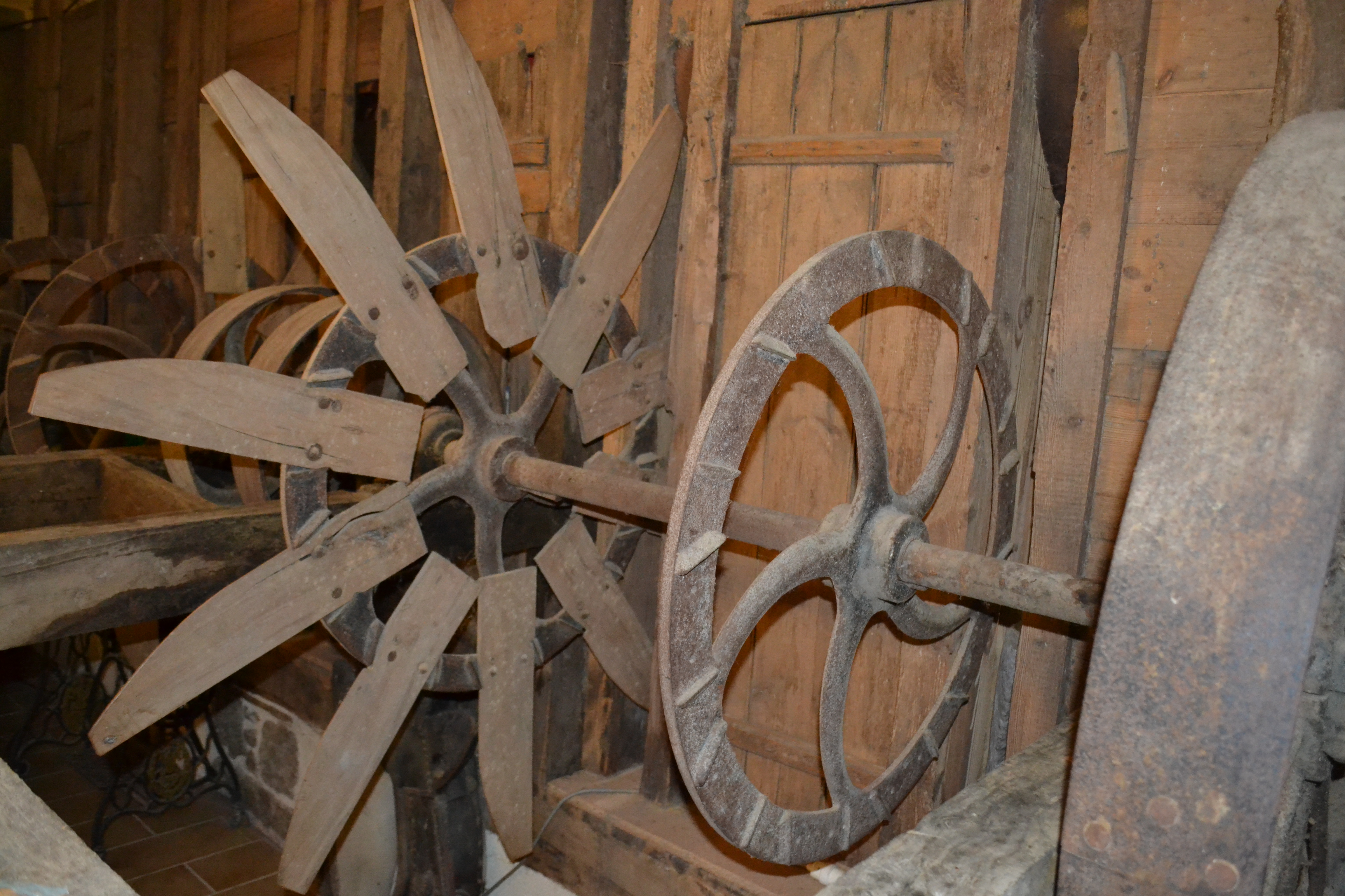 Détail des spatules en bois fixées autour de l'axe de rotation via un moyeu en fonte d'acierImmatriculation