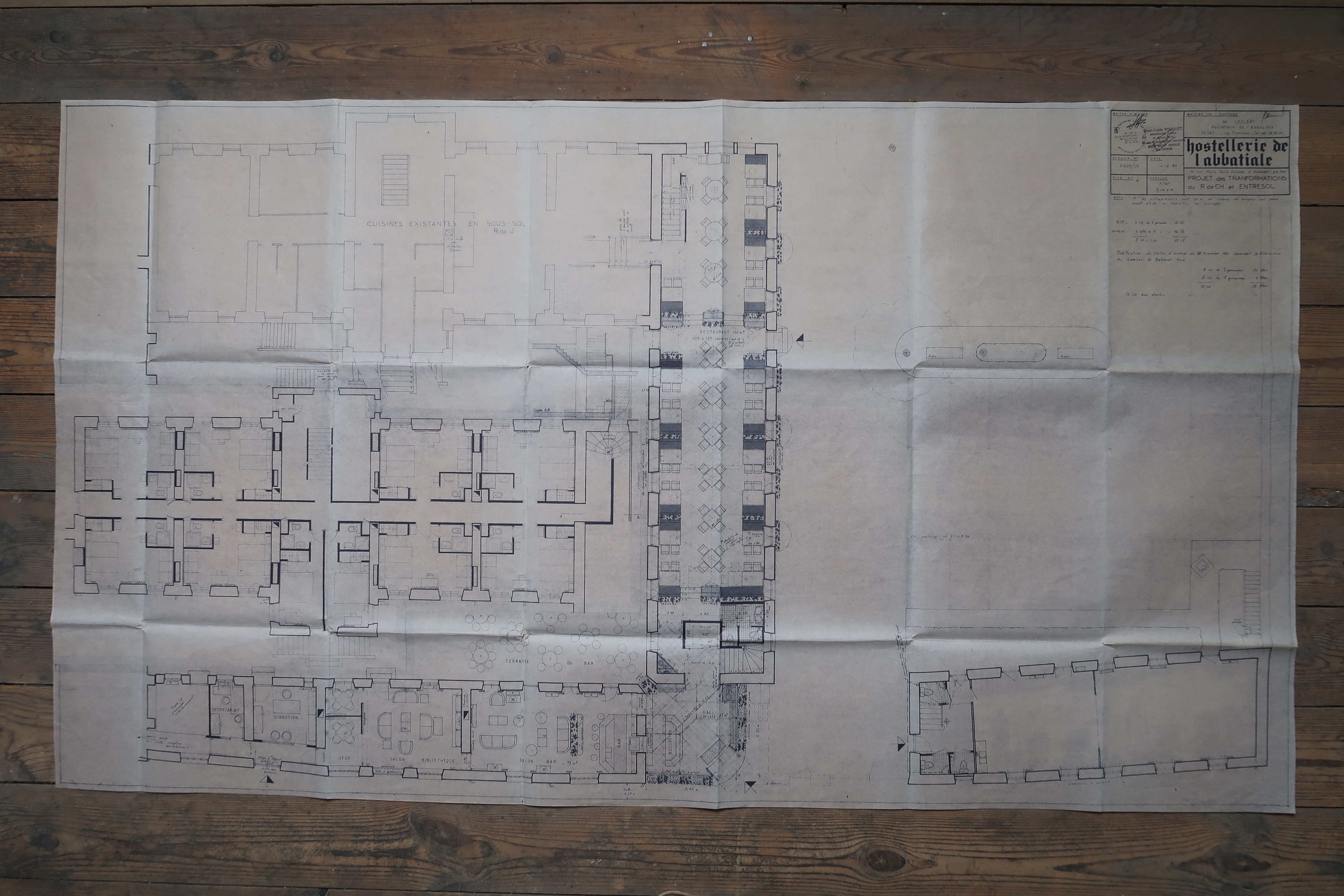 Plan de modification pour la transformation en hôtel "L'Abbatiale", plan du rez-de-chaussée et de l'entre-sol, daté du 14 juin 1984.Immatriculation