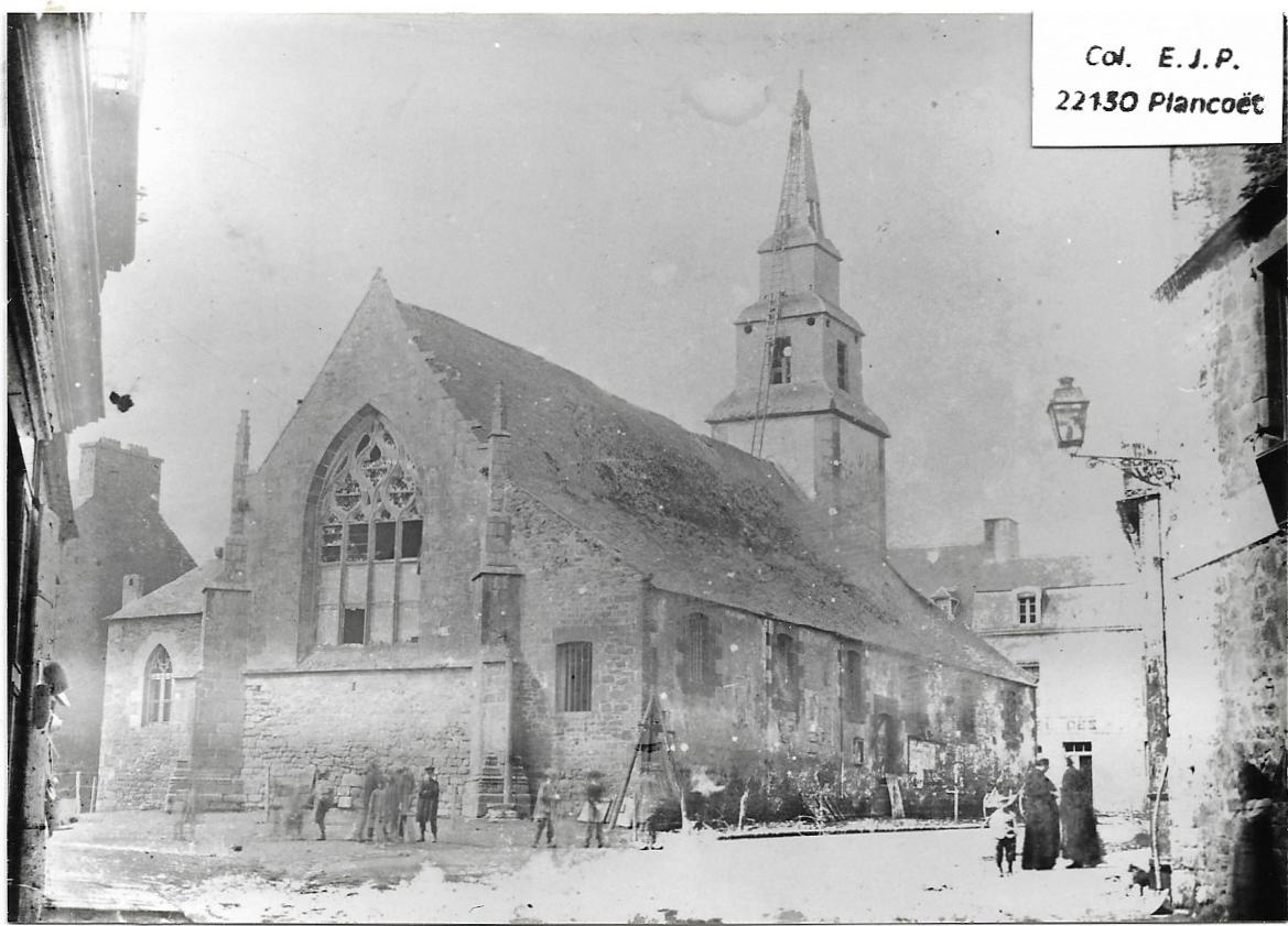 Eglise Saint-Sauveur au début de sa déconstruction pour faire place à la nouvelle Mairie vers 1895. Le pignon de l'ancienne mairie, construite au devant des Halles, est visible sur la photographie, à gauche de l'église.Immatriculation