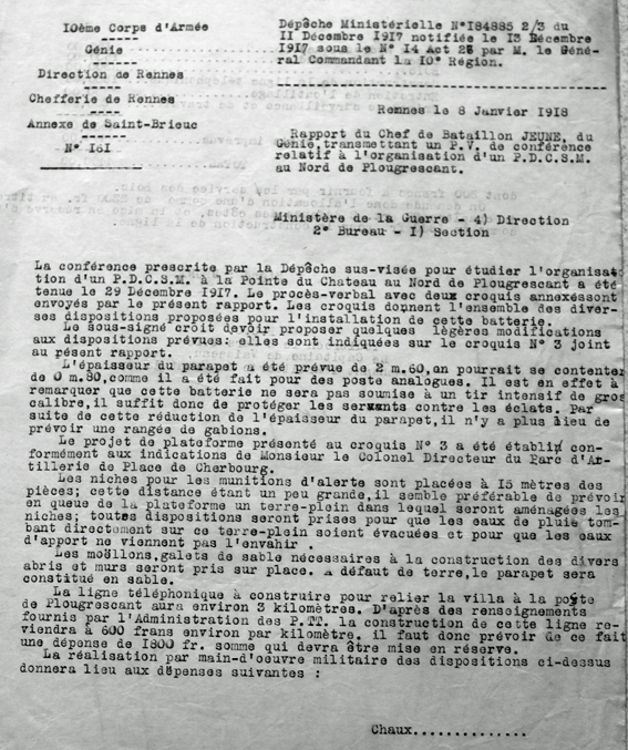 Procès-verbal de conférence relatif à l’organisation d’un Poste de Défense Contre les Sous-Marins au nord de Plougrescant (source : Service Historique de la Défense, Cherbourg)Immatriculation