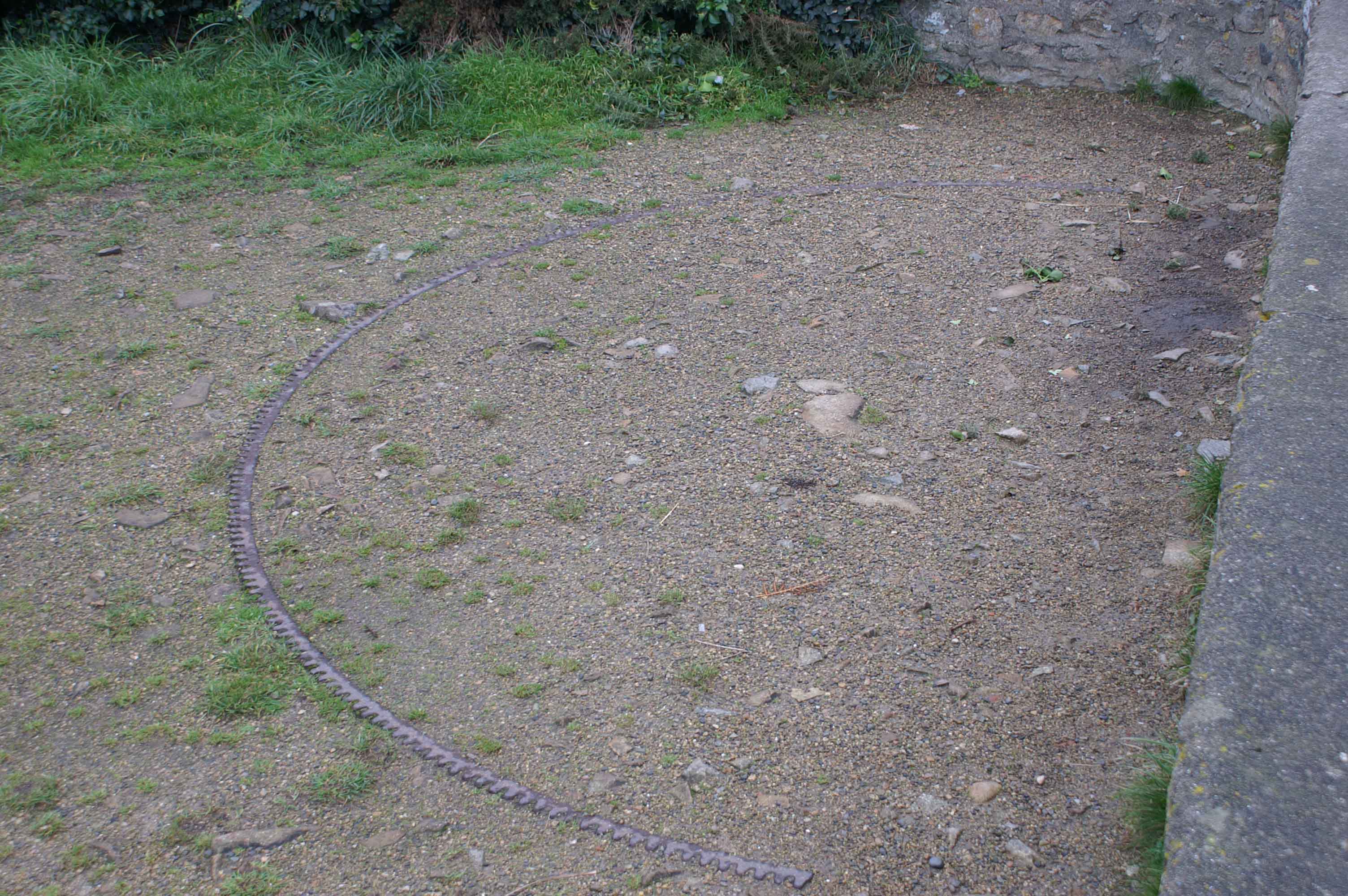 Détail d’un emplacement de batterie d’un canon de 90 mm modèle 1881 sur affût de côte modèle 1879 (photographie : Alain Bohée). La demi-couronne métallique dentelée permettait le pointage en azimut de l’affûtImmatriculation