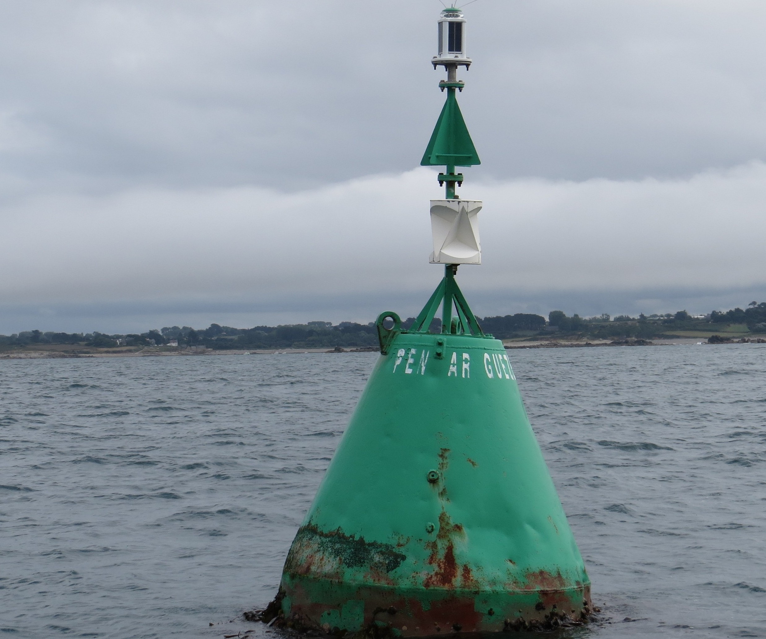 Bouée tribord du petit Pen ar Guézec, complètement à l’est des espars tribord longeant les hauts fonds bordant l’île d’Er. Marque obligatoire pour les bateaux à fort tirant d’eau (photographie : Michel Le Hénaff)Immatriculation