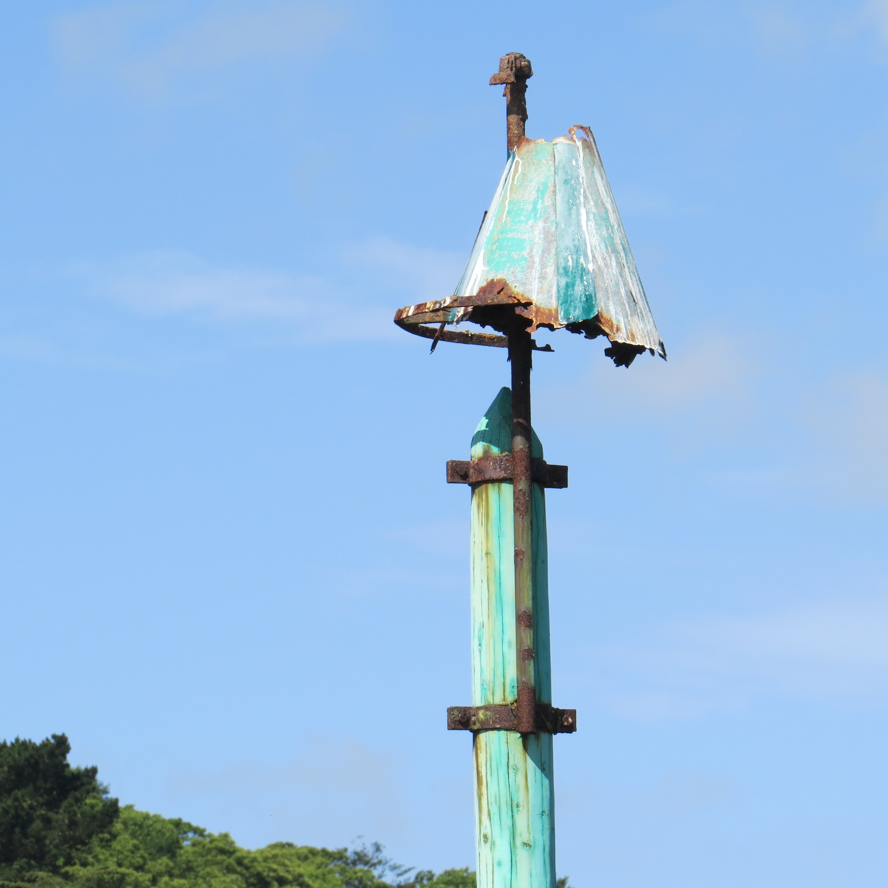Sommet de la perche tribord de Pors Don, perche excentrée, d’où sans doute la vétusté… Témoin d’une fabrication ancienne : perche de bois, les documents anciens parlent d’orme, surmonté d’une ferrure portant un cône en fer aujourd’hui très oxydé (photographie : Michel Le Hénaff)Immatriculation