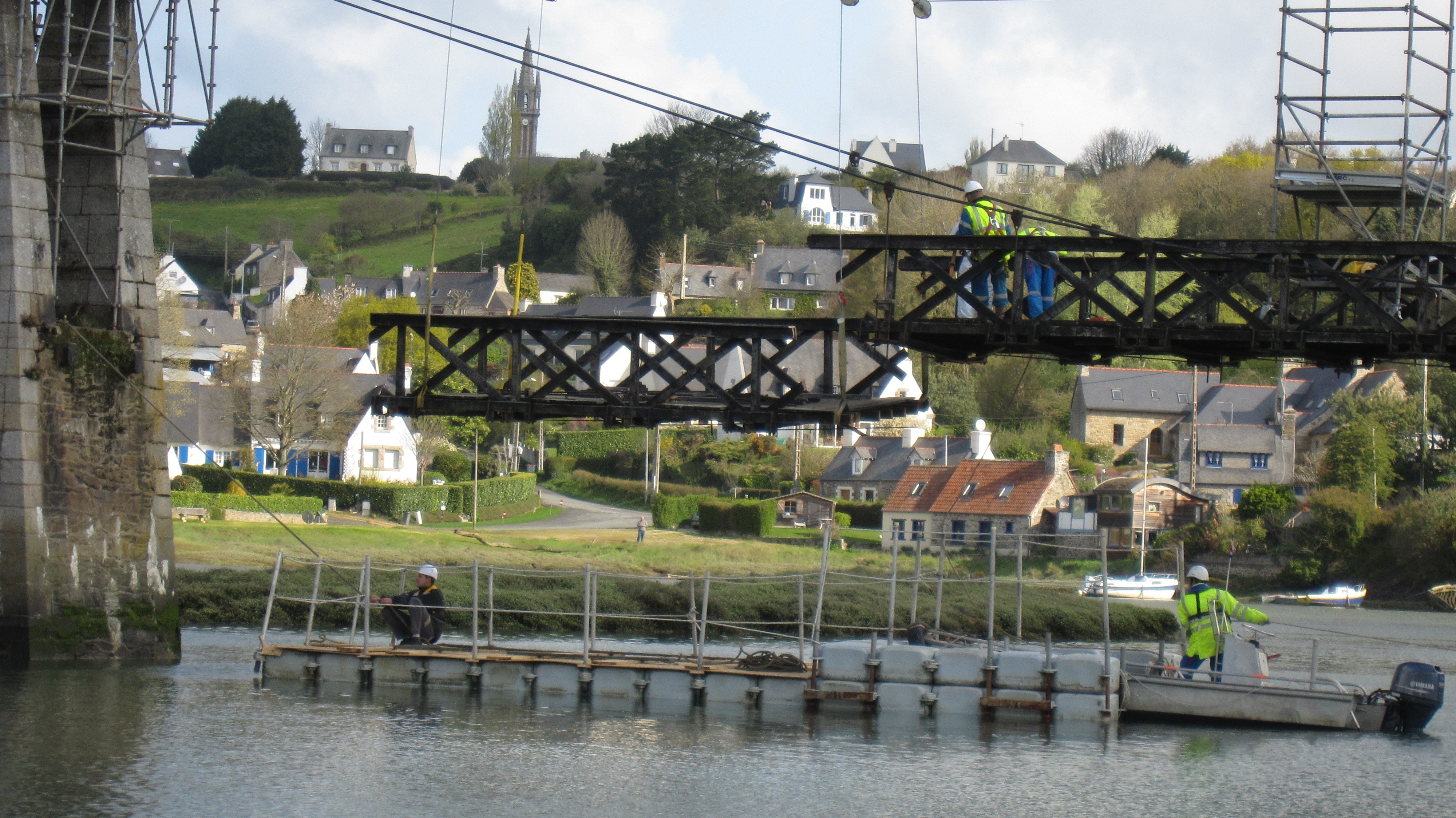 Plouguiel - Tréguier : pont dit "passerelle Saint-François", mai 2012, dépose du tablier en bois par tronçon évacué par chaland, entreprise FreyssinetImmatriculation