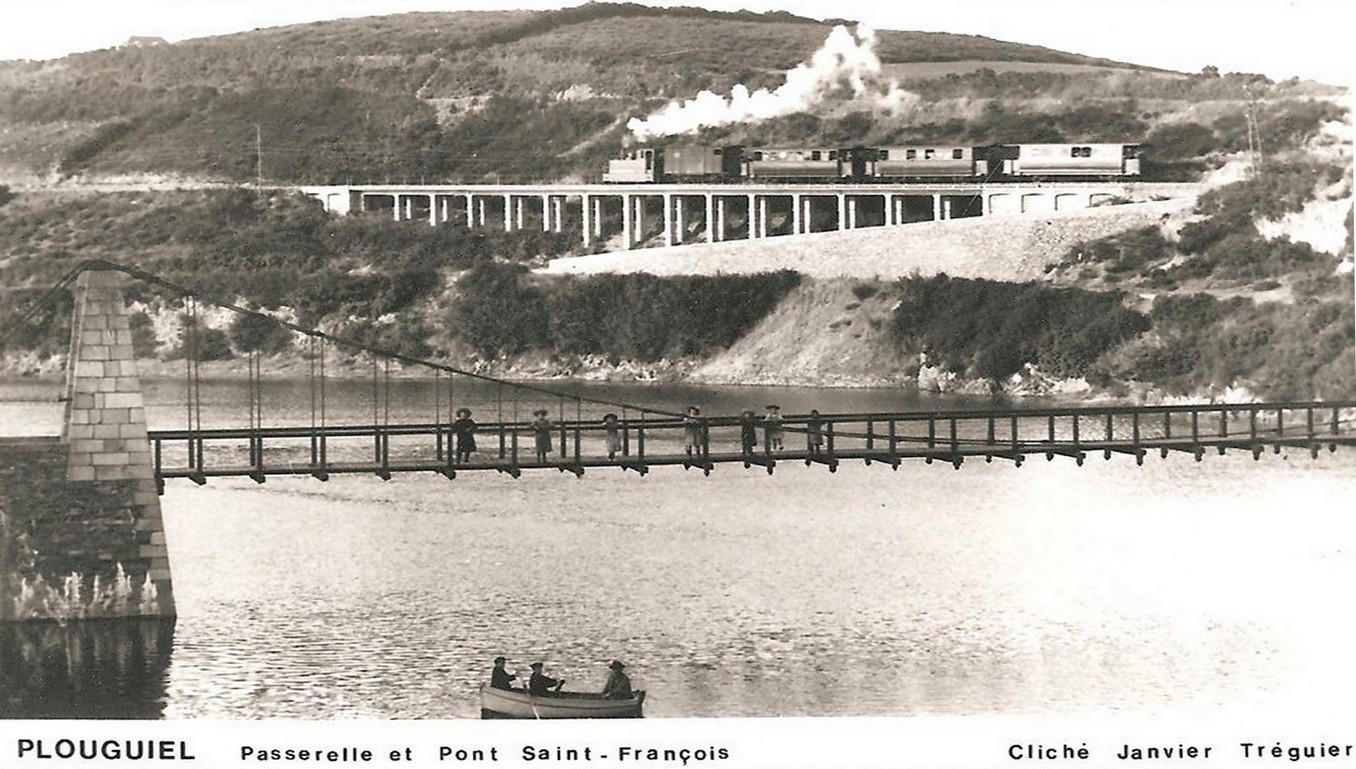Ligne Tréguier - Perros-Guirec, la deuxième passerelle de 13 travées, le train peine à gravir cette rampe vers Plouguiel devant le pont suspendu de Saint François construit en 1834 (collection réunie par Michel Le Hénaff)Immatriculation