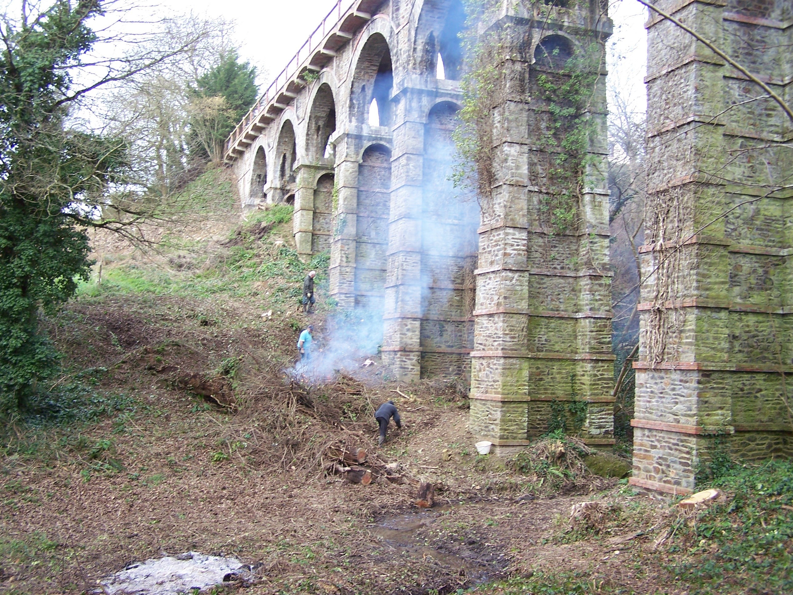Ligne Tréguier - Perros-Guirec, le viaduc de Kerdéozer, vue de la vallée, avec les bénévoles des Priel’s Trotters au débroussaillageImmatriculation