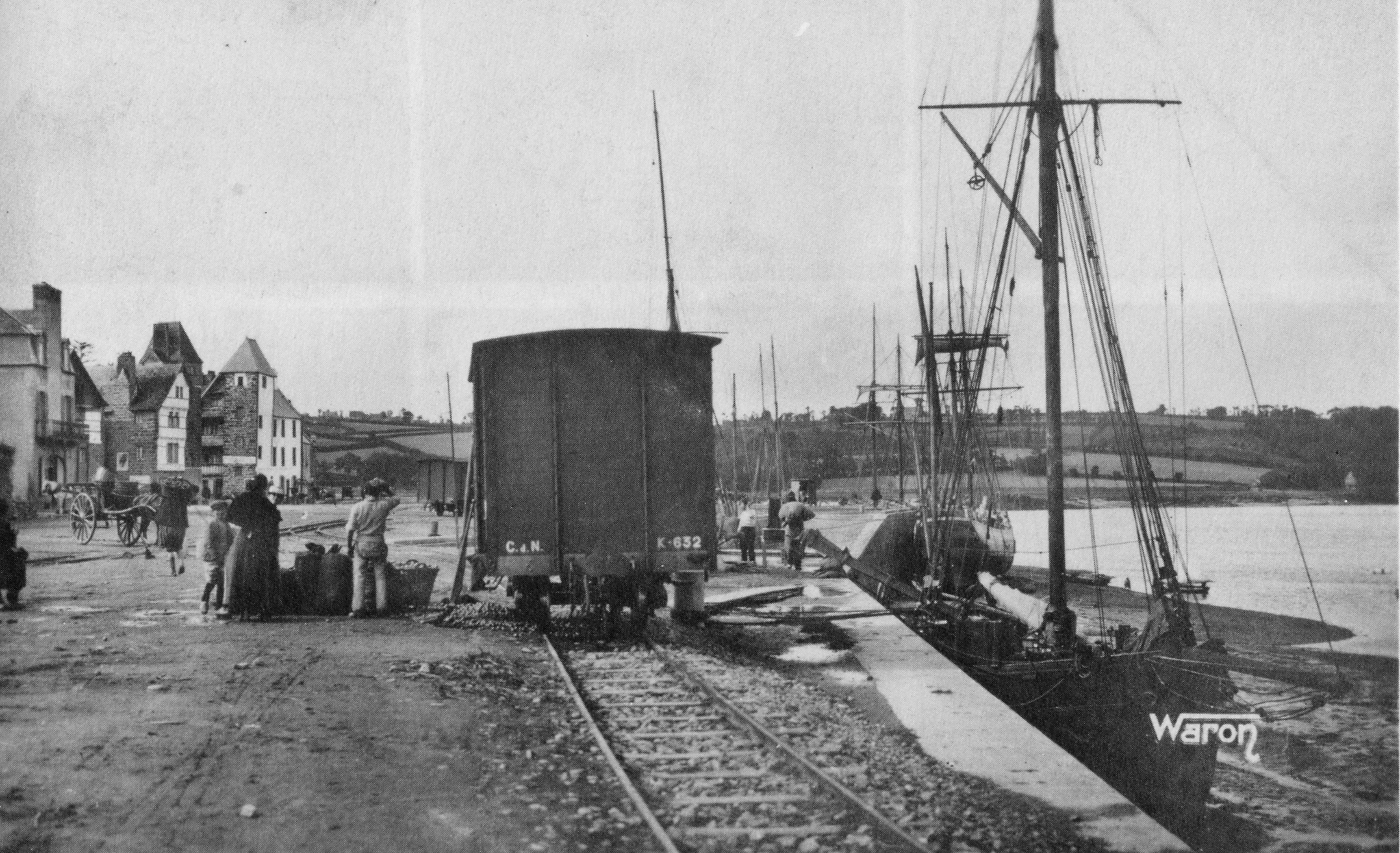 Déchargement de pommes à cidre d’un wagon, carte postale (collection particulière). nous visualisons bien le sloop, échoué au vieux quai. La photographie témoigne de la cohabitation entre le port et le chemin de ferImmatriculation