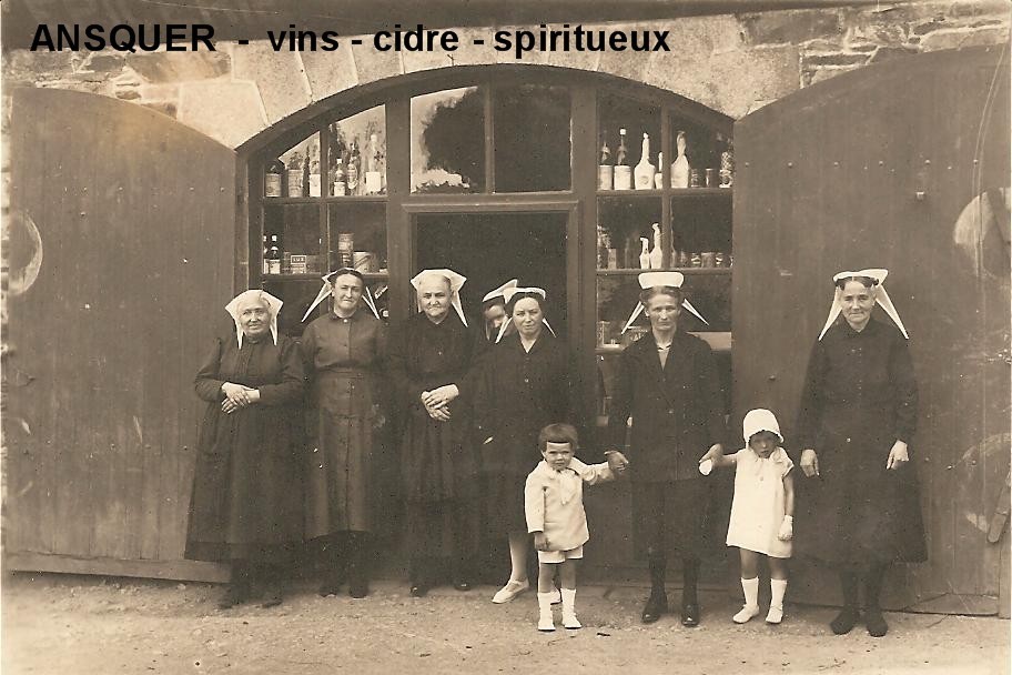 Magasin de détail de la maison Ansquer, 6 rue des Perdreries (Perderies) à Tréguier. La gent féminine pose, coiffée de la Toukenn (collection François Augès)Immatriculation