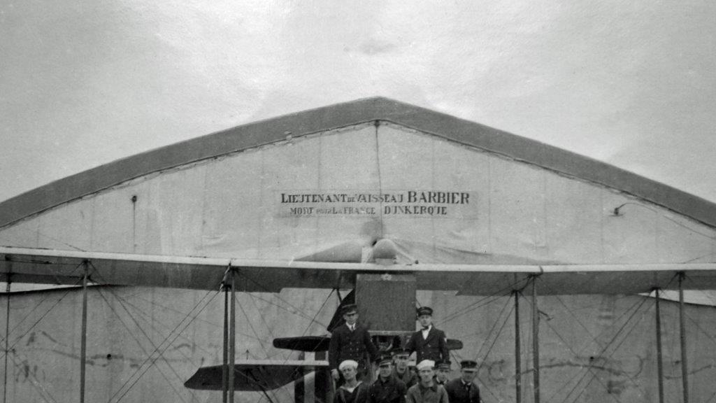 Vue du centre d'aviation maritime de Tréguier, détail du hangar central, le personnel est états-unien (source : United States Navy)Immatriculation