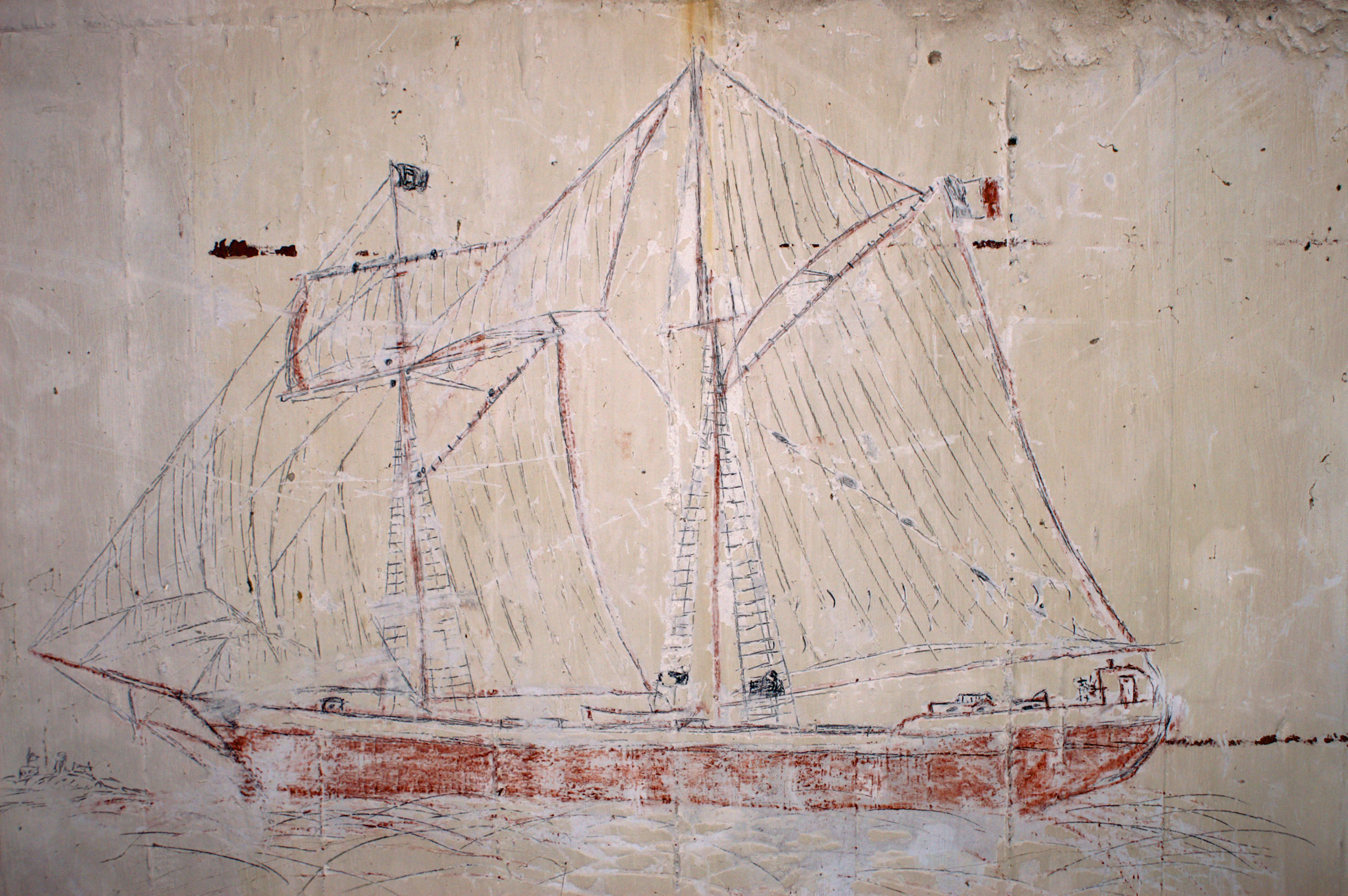 Dessin d’une goélette paimpolaise à hunier, dessinée dans un petit abri par Loïc Bourdon lors de son séjour sur l’île à Bois au début des années 1950Immatriculation