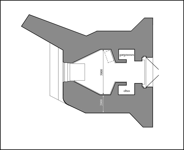 Plan d’une casemate de type 612 (dessin : Alain Bohée). Fouille : 120 m3, béton : 385 m3, ferraillage : 17 tonnes, fer en i : 4,1 tonnes. Les soutes à munitions ont une capacité de 500 coups de 7,5 cm. L’embrasure permet un débattement de 60° en azimut et de -5 à +10° en site. Si un dispositif d’aspiration d’une puissance d’absorption de 60 m3 par minute n’est pas installé la ventilation est assurée par un courant d’air entre l’embrasure et la porteImmatriculation