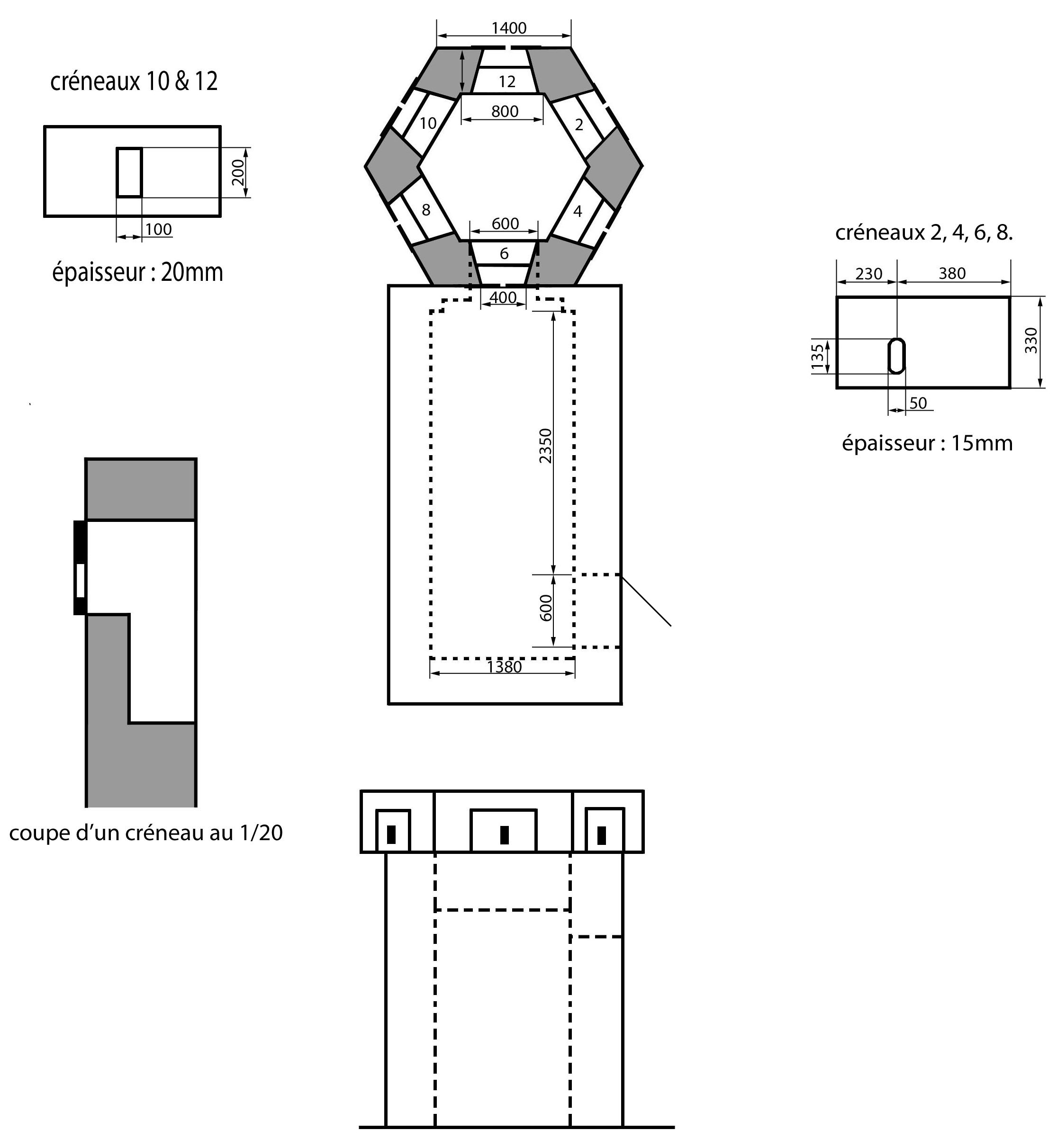 Plan de l’emplacement de combat bétonné. Les embrasures sont protégées par des cuirassements pour une arme individuelle (dessin : Alain Bohée)Immatriculation