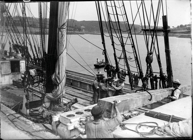 Chargement des poteaux de mine pour le pays de Galles au port de TréguierImmatriculation