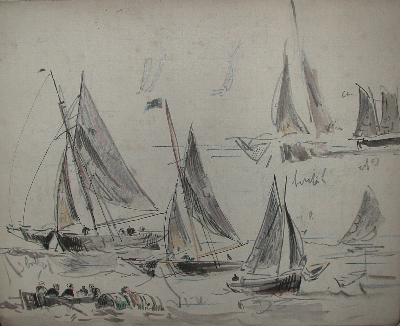 Sloops et barque de pêche armée par des Loguiviennes, dessin aquarellé, FaudacqImmatriculation
